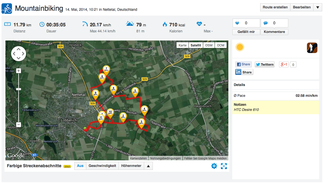 Die Standortbestimmung wird über ein A-GPS-Modul realisiert und funktioniert sehr gut. Bereits in geschlossenen Räumen erfolgt eine grobe Ortung, die im Freien deutlich zunimmt. Unser Navigations-Test mit dem Fahrrad auf einer definierten Teststrecke im direkten Vergleich zu einem Garmin Edge 500 fällt sehr positiv aus. Es entstehen nur geringe Abweichungen zum dedizierten Navigationsgerät, gerade in schwierigen Passagen, wie der Walddurchfahrt, klappt die Ortung gut. Das HTC Desire 610 ist also gut geeignet für verhältnismäßig genaues Navigieren.
