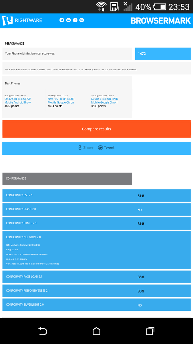 Die Browserperformance des HTC Desire 820 kann sich ebenfalls sehen lassen und wird lediglich von den Konkurrenten mit stärkeren Prozessoren übertroffen. Rein subjektiv betrachtet, ist die Surfgeschwindigkeit nicht zu beanstanden, denn Webseiten werden zügig aufgebaut.