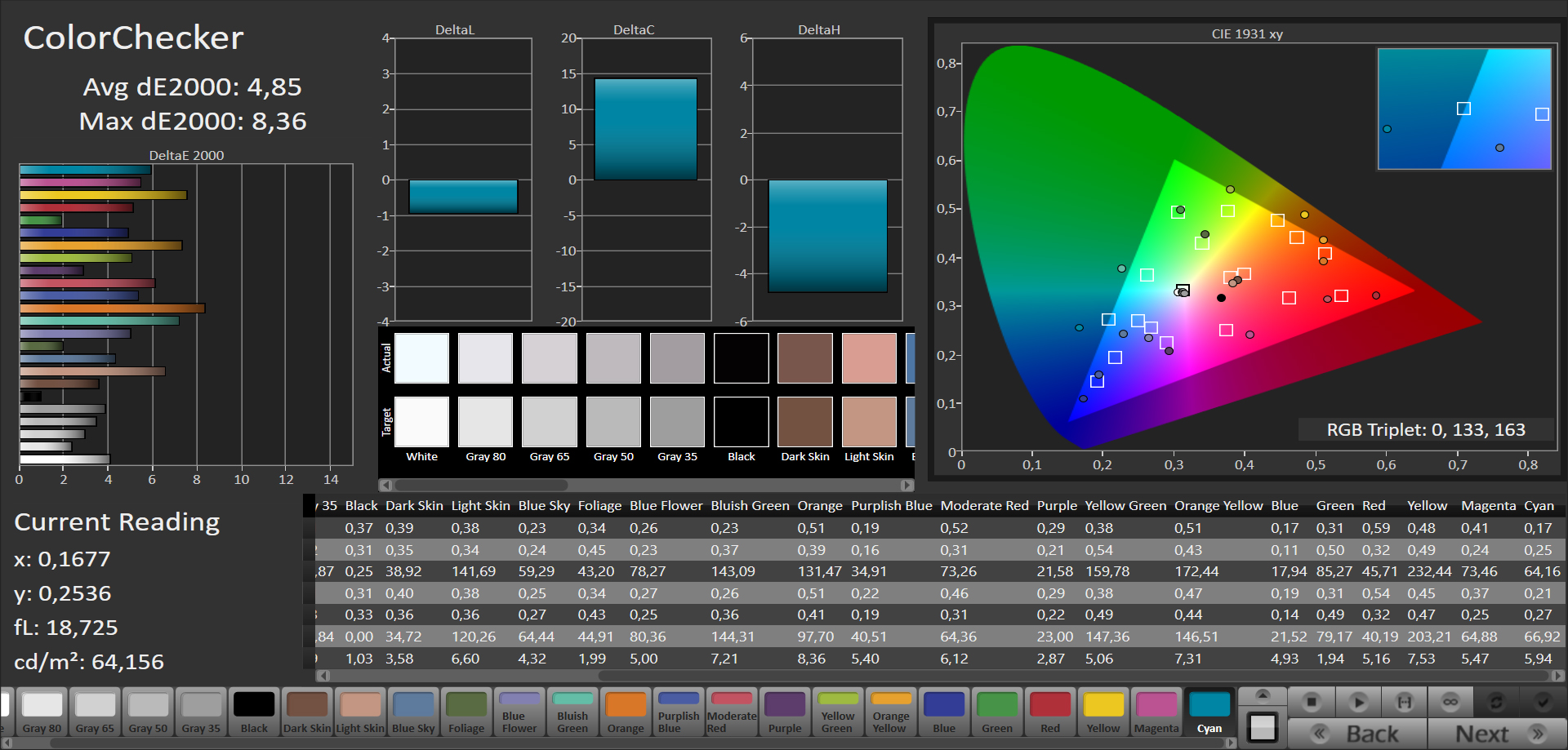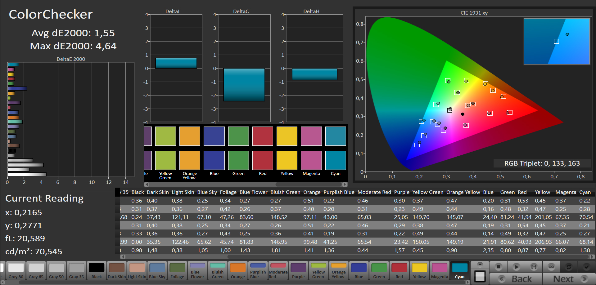 | Delta E Colorchecker * | 1.55 | 4.7 -203% | 6.32 -308% | 7.37 -375% | 2.51 -62% | 3.92 -153% |
