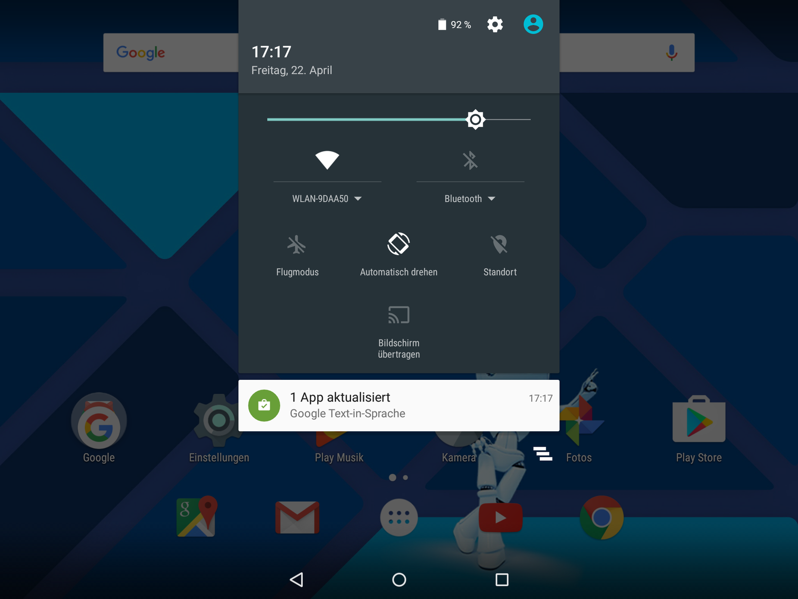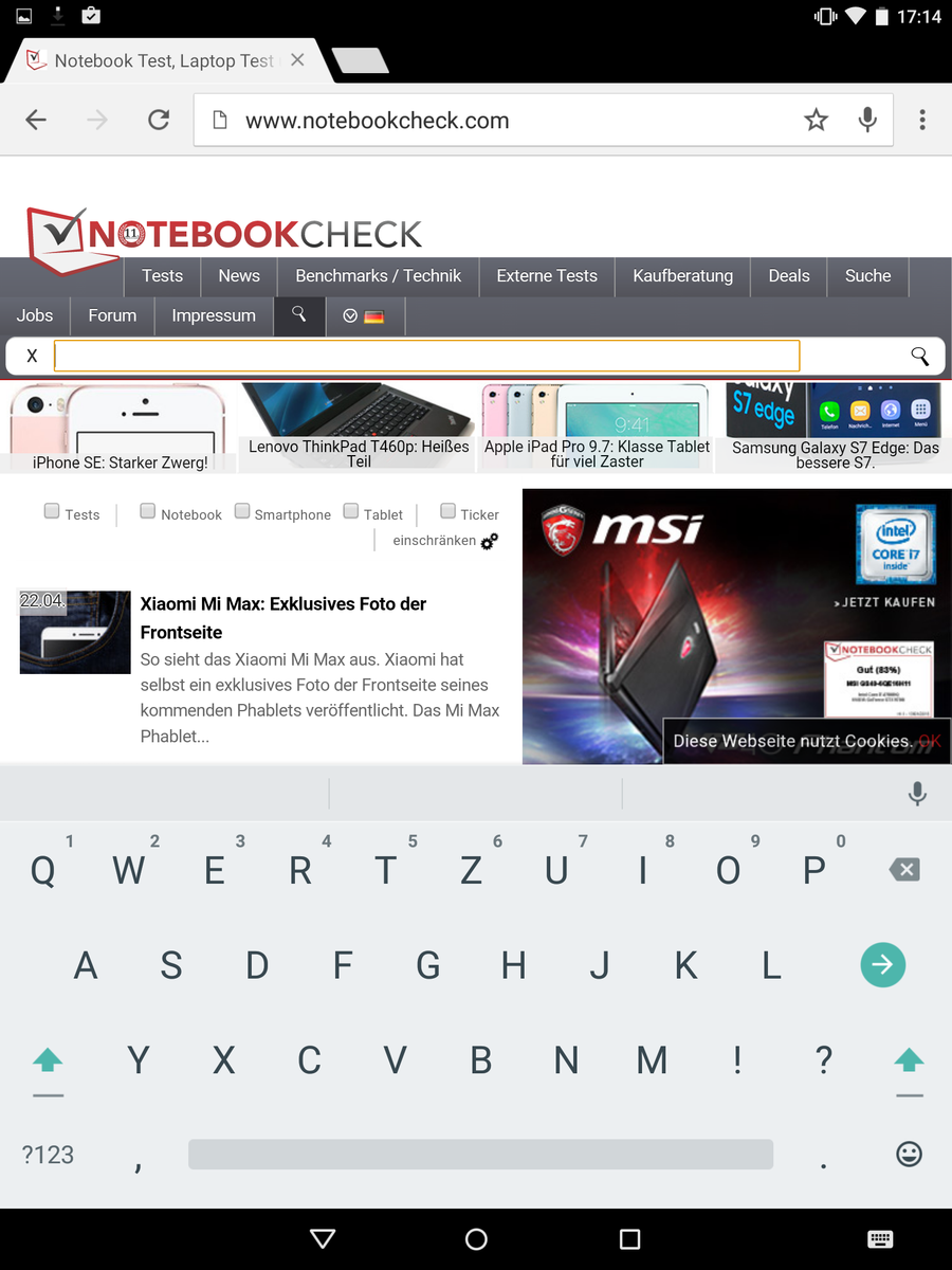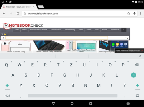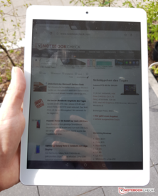 Im Freien schlägt sich der LC-Display gut, Reflexionen und direkte Sonneneinstrahlung kann das Tablet selbst bei höchster Helligkeitsstufe jedoch nicht ausgleichen. Die Blickwinkel sind IPS-typisch auf einem sehr hohen Niveau. Selbst aus sehr flachen Betrachtungswinkeln werden Inhalte kaum abgedunkelt. Farbveränderungen sind nicht erkennbar.