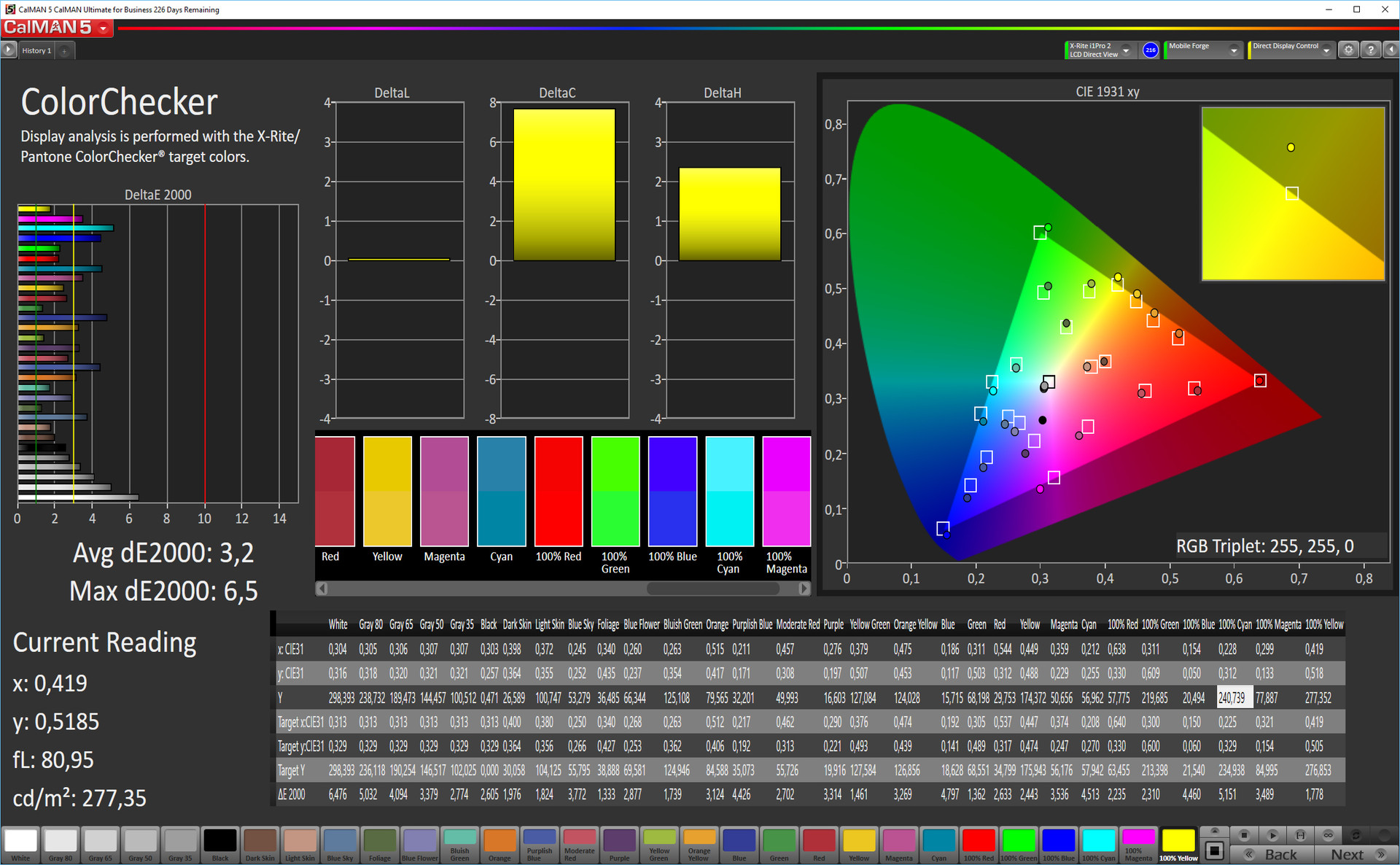 | Delta E Colorchecker * | 3.2 | 4.18 -31% | 4.98 -56% | 3.25 -2% | 4.31 -35% | 2.86 11% |