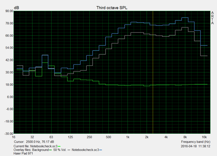Der Monolautsprecher ist auf der Rückseite des Tablets positioniert. Er bietet einen vergleichsweise ordentlichen Klang, doch fehlt dem Klangbild eine gewisse Ausgeglichenheit. Wie die Analyse des Pink-Noise-Diagrammes zeigt, sind Bässe kaum wahrzunehmen. Dagegen werden Töne in den hohen Bereichen gut differenziert wiedergeben. Störgeräusche sind bei der Musikwiedergabe über die eingebauten Lautsprecher des Haier Pad 971 nicht aufgetreten. Mit maximal 89,6 dB(A) gehören sie zu den lautesten im Vergleichsfeld.