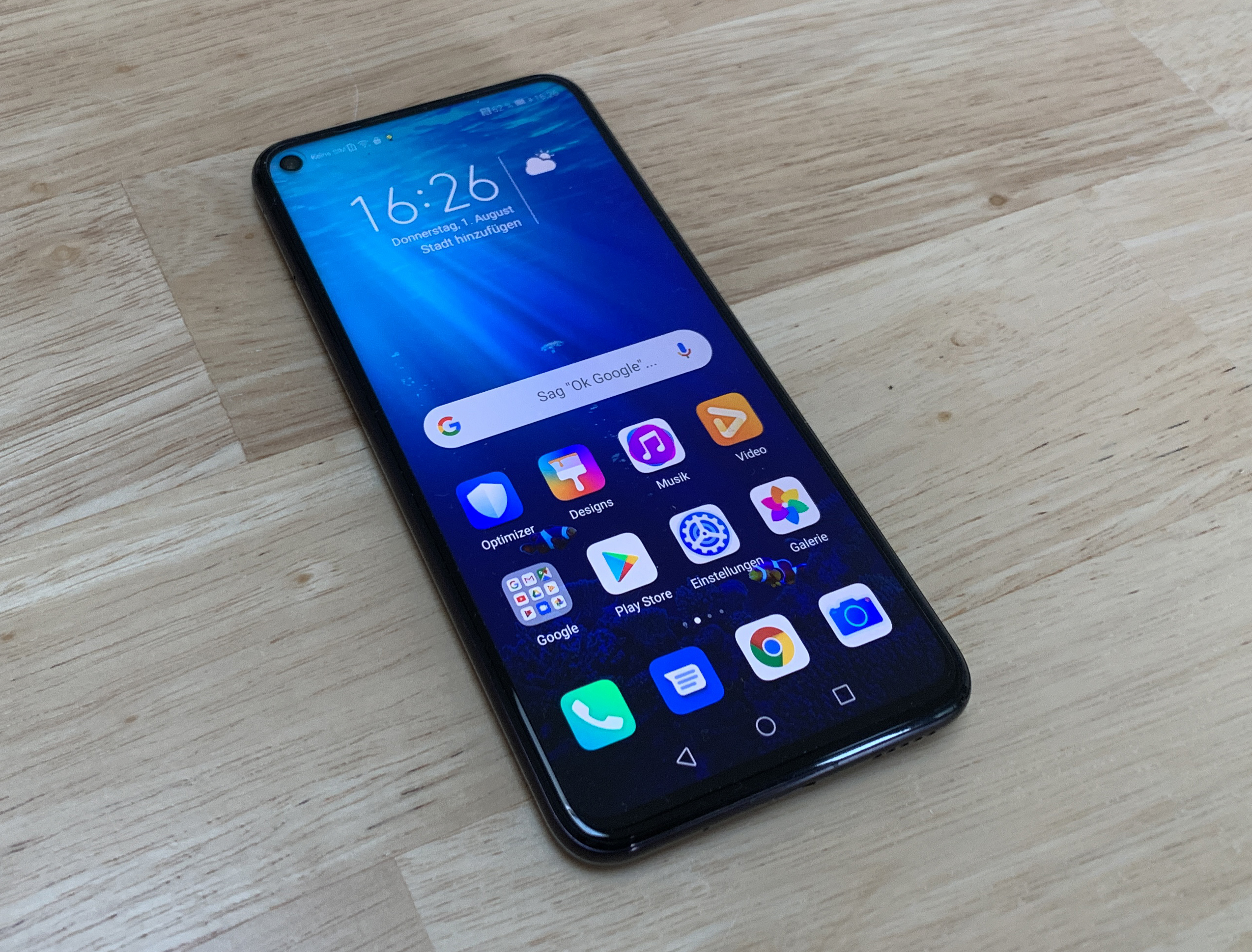 Den Fingerabdrucksensor hat Honor an die Seite des Gerätes in den Einschalter gelegt, so ist er recht intuitiv erreichbar, verunstaltet aber die Rückseite nicht. Eine Notch am Bildschirm gibt es nicht, stattdessen liegt die Kamera im linken, oberen Eck des Bildschirms. Honor spricht von 91,7%, die der Bildschirm im Vergleich zur Vorderseite einnimmt, wir kommen rechnerisch auf knapp 85 % Screen-to-Body-Ratio, das bedeutet schmale Ränder, die aber immer noch deutlich sichtbar sind.