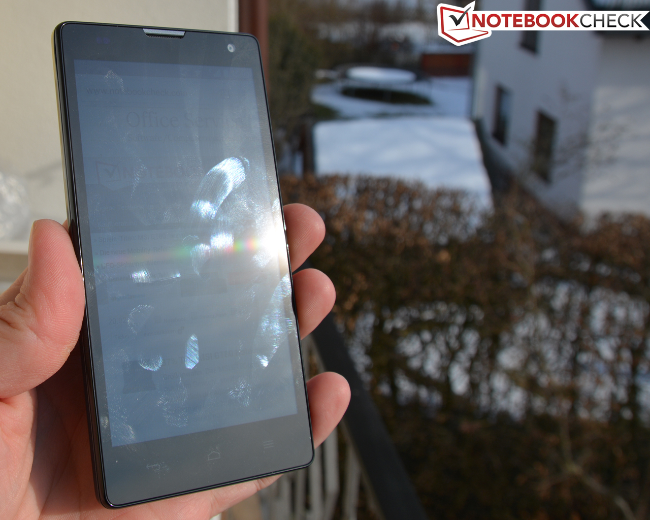 Beim Außengebrauch profitiert das Honor 3C zwar von seinem hellen Bildschirm, da dieser jedoch wie alle Smartphones einen spiegelnden Bildschirm besitzt, ist direkter Lichteinfall problematisch. Insgesamt reicht die Helligkeit des Displays dennoch aus, um auch draußen noch gut ablesbar zu bleiben.