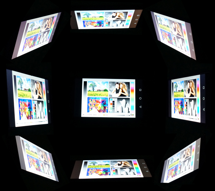 Als IPS-Display hat der Bildschirm keine Probleme auch mit flachen Blickwinkeln. Mit bloßem Auge sind auch keine Farbabweichungen erkennbar, die Kamera hingegen sieht deutliche Unterschiede beim Kontrast, je nachdem aus welchem Winkel man den Bildschirm betrachtet.
