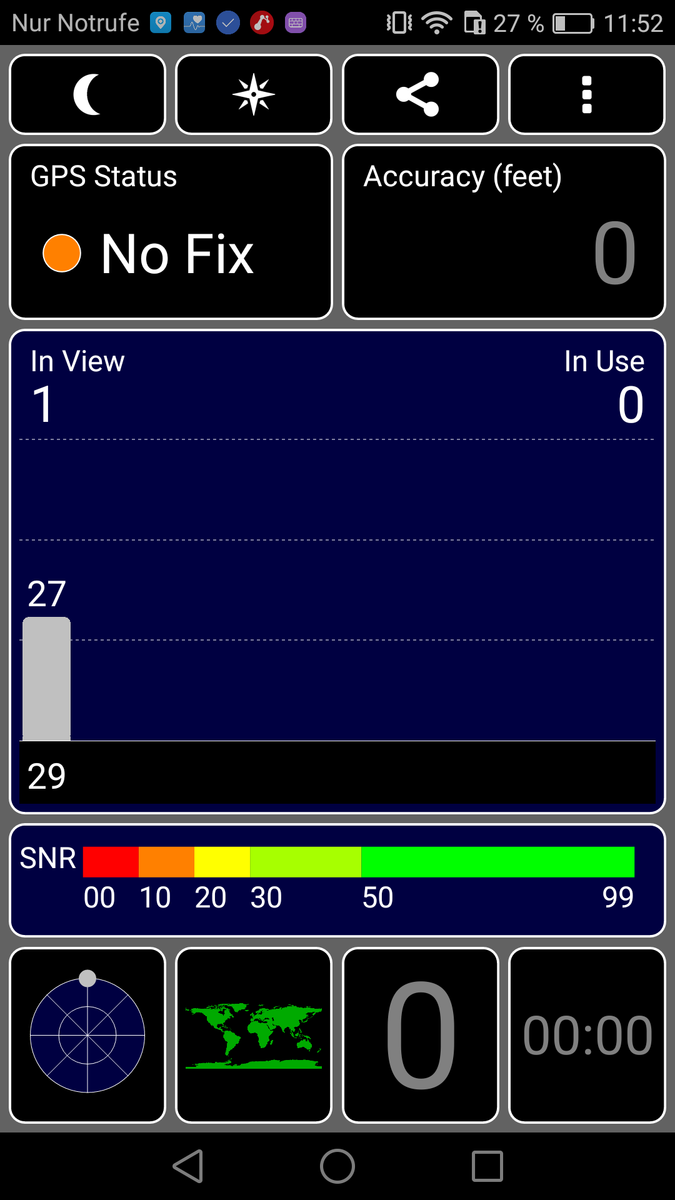 Das eingebaute GPS-Modul kann uns in Innenräumen nicht orten, und auch im Freien braucht es verhältnismäßig lange, bis genügend Satelliten für die Ortung angepeilt sind.