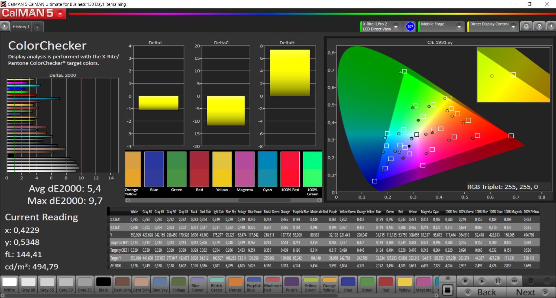 | Colorchecker dE 2000 max. * | 4.5 | 9.8 -118% | 8.8 -96% | 4.1 9% | 9.1 -102% | 9.9 -120% | 8.8 -96% |