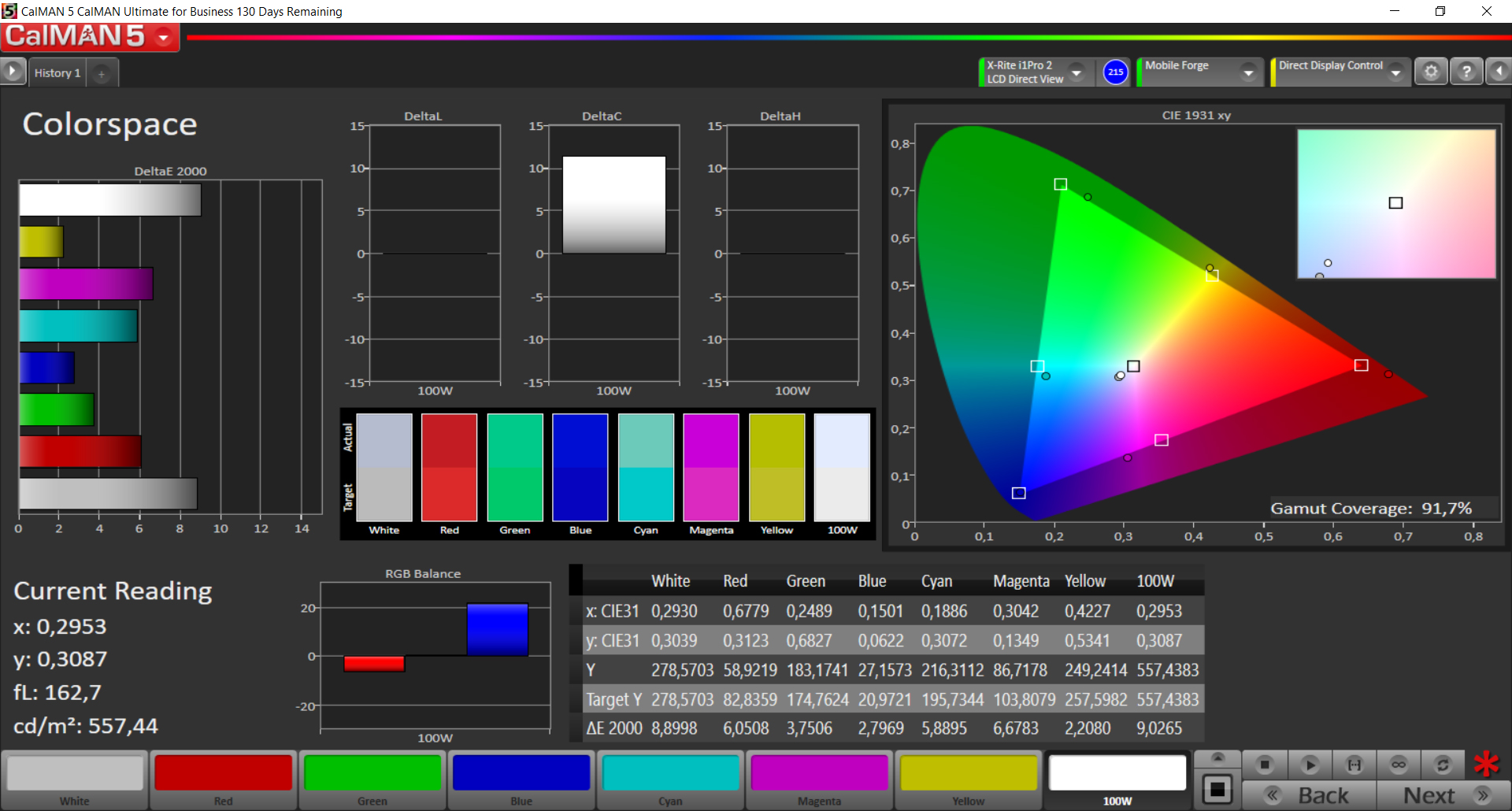 Wir testen den Bildschirm noch genauer mit unserem Spektralfotometer und der Software CalMAN, wir nutzen für unsere Tests die Farbräume AdobeRGB, sRGB und DCI-P3, der für Filmprojektionen verwendet wird. In der Einstellung Standard messen wir einen deutlichen Blaustich, durch die Weißabgleicheinstellung Warm verschwindet er großteils und die Farbabweichungen sind auch wesentlich geringer. Die Farbraumabdeckung des DCI-P3 ist im Modus Warm recht gut, auch AdobeRGB wird im Modus Standard immerhin zu knapp 92 % abgedeckt.