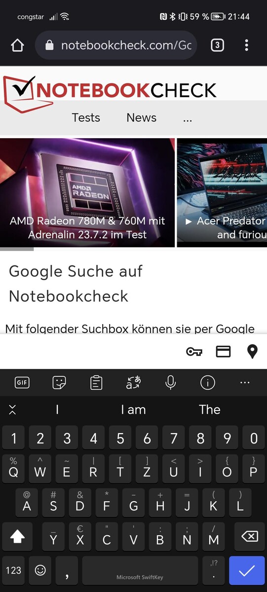 Honor setzt ab Werk auf die SwiftKey-Tastatur von Microsoft. Das Display reagiert prompt auf Eingaben und auch längeres Tippen ist ohne Probleme möglich. Das Tastaturlayout in Verbindung mit den abgerundeten Seiten kann allerdings zu Beginn zu Fehleingaben führen. Auffällig ist, dass die Tastatur im Querformat enorm viel Platz benötigt. Vor allem mit den ab Werk aktivierten Zusatzleisten ist außer der Tastatur kaum etwas zu sehen.