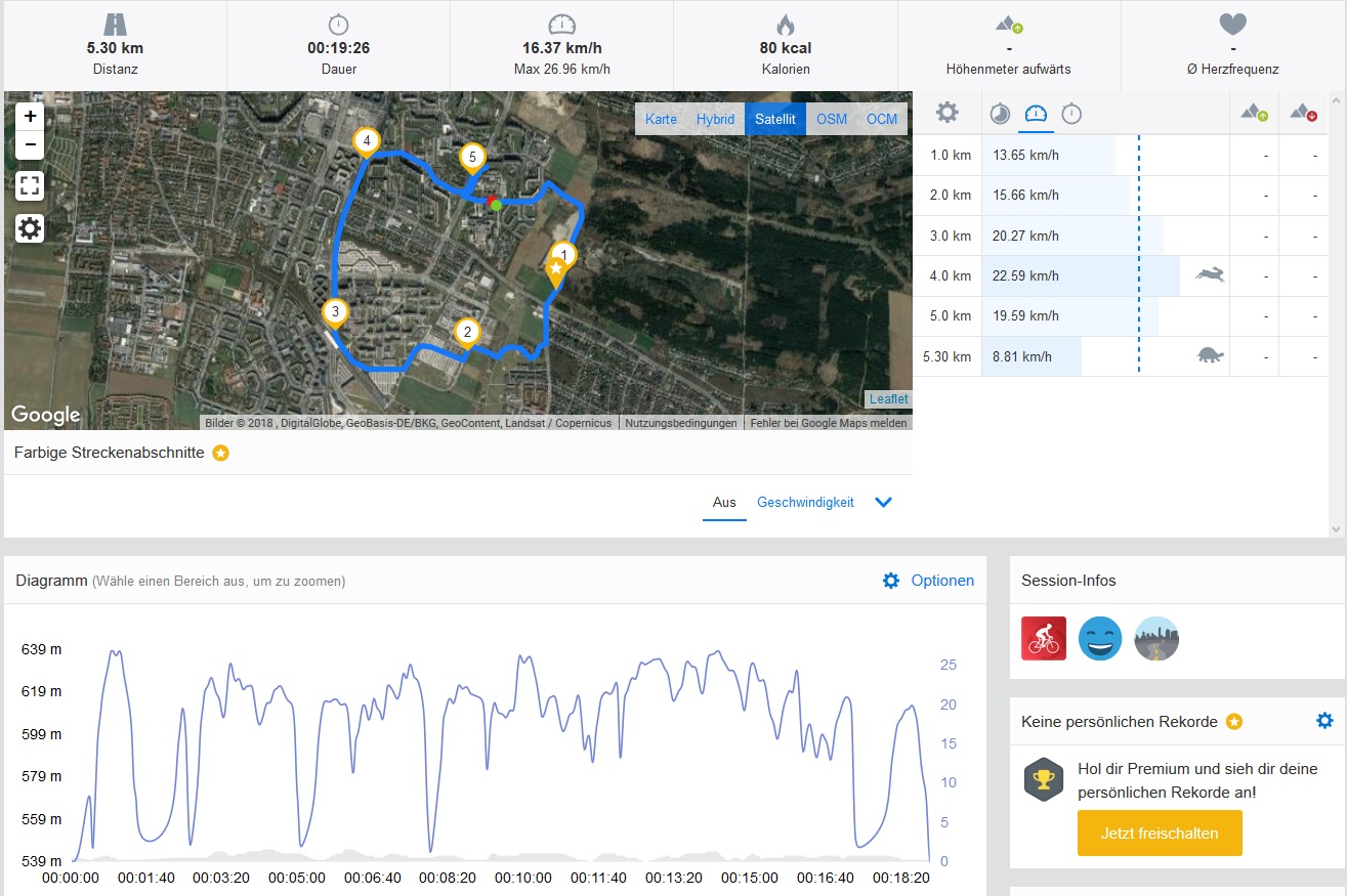 Zusätzlich testen wir die Praxistauglichkeit des GPS-Moduls auf einer Fahrradtour, die wir parallel mit einem Garmin Edge 520 aufnehmen. Letzteres zeichnet unsere Routen normalerweise sehr genau auf. Am Tag des Tests weist die Aufzeichnung des Profi-Navis in der Nähe eines Wäldchens allerdings ein paar Schlenker auf, so dass wir selbige auch beim Honor Magic 2 temporären Umständen zuschreiben. Dennoch weist das Honor Magic 2 gleich zu Beginn der Strecke noch ein paar mehr Ungenauigkeiten auf.