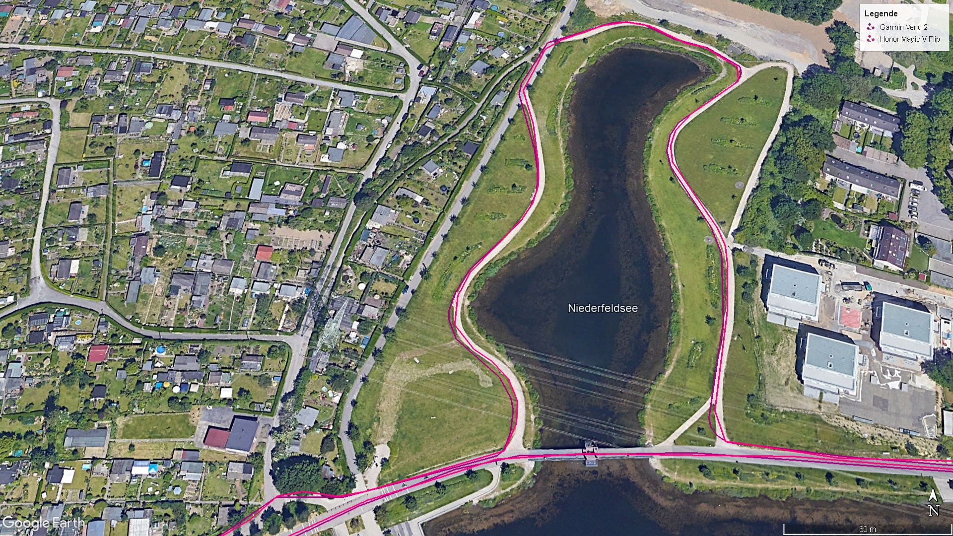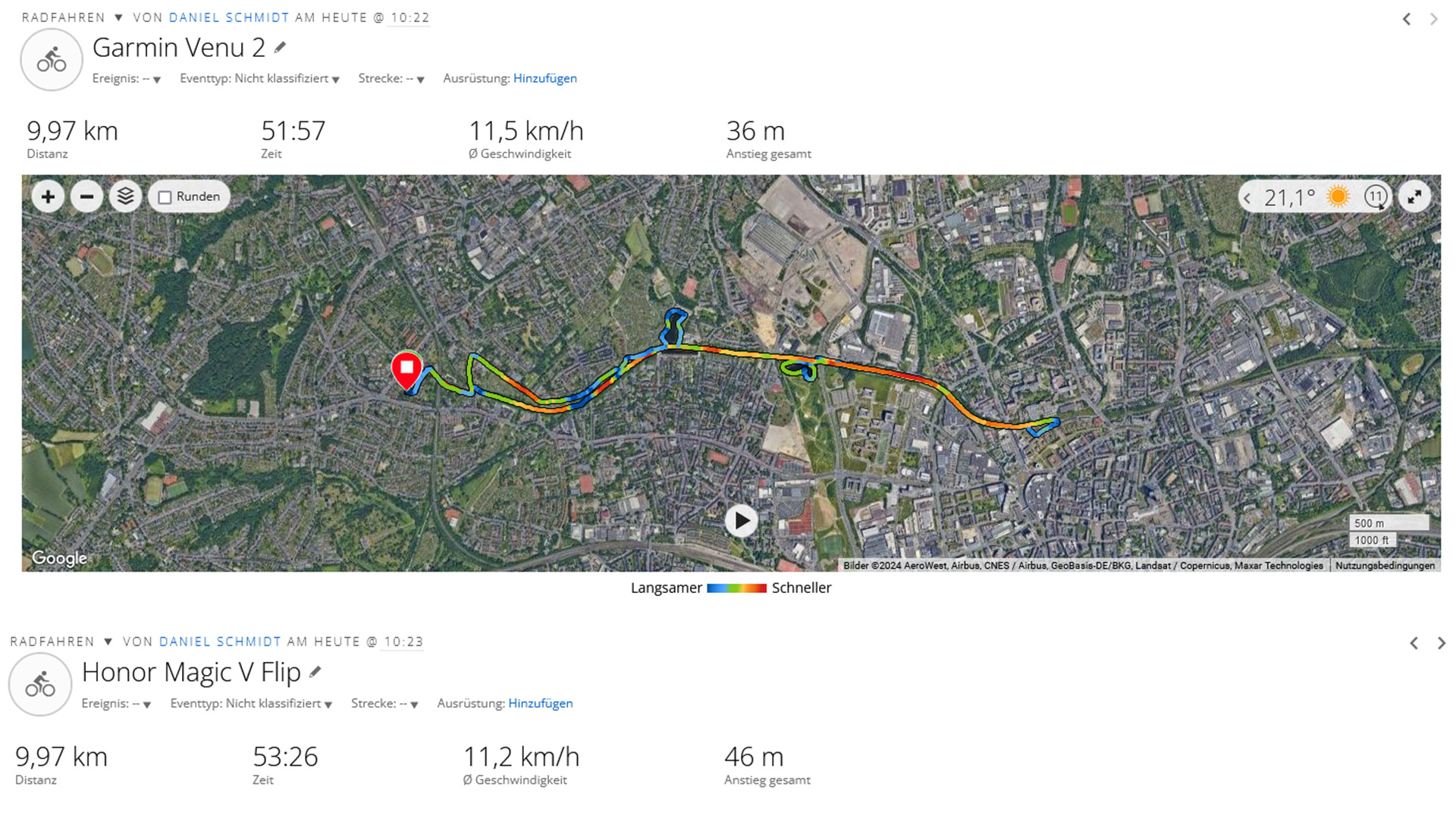 Das Magic V Flip findet sowohl innerhalb von Gebäuden als auch im Freien sehr schnell ein GPS-Signal und kann uns dann jeweils bis auf 3 Meter genau orten. Im Praxistest gibt es sich ebenfalls keine Blöße. Auf einer rund 10 Kilometer langen Fahrradtour zeichnet es die Wegstrecke praktisch genauso präzise auf wie das Vergleichsgerät, die Fitness-Smartwatch Garmin Venu 2.