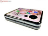 Durch sein vergleichsweise großes 4-Zoll-Panel gerät auch das Arbeiten mit dem Außendisplay nicht zur fummeligen Angelegenheit, weil die Schaltflächen eine angenehme Größe besitzen. Die Falte im Bereich des Scharniers ist kaum spürbar und bleibt im Betrieb nahezu unsichtbar. Wirklich auffällig wird sie letztlich nur bei schwarzem Display-Hintergrund.
