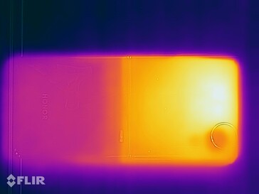 Im Betrieb kann sich das Magic V Flip stark erhitzen. Wie es im Worst Case aussieht, simulieren wir durch eine Stunde Stresstest mit dem Burnout Benchmark. An Oberfläche im Bereich der Kameras messen wir dann bis zu 47 °C. Das ist nicht nur deutlich spürbar, sondern fühlt sich auch schon unangenehm an. Wie die Stresstests von 3DMark zeigen, drosselt das Honor unter Last bereits nach kurzer Zeit seine SoC-Leistung.