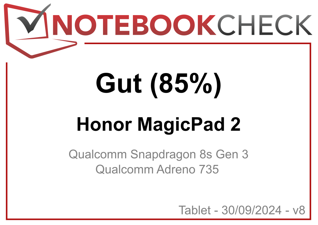 | 84.8 % | v8 | 09 / 2024 | Honor MagicPad 2 SD 8s Gen 3, Adreno 735 | 555 g | 5.8 mm | 12.30" | 3000x1920 | |