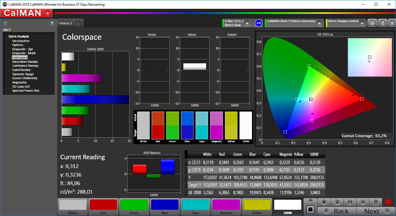 | Color Space (Percent of sRGB) (%) | 62.66 | 65.31 4% | 59 -6% | 54 -14% | 59 -6% | 59.4 -5% | 96 53% | 59.2 -6% | 62.5 0% |