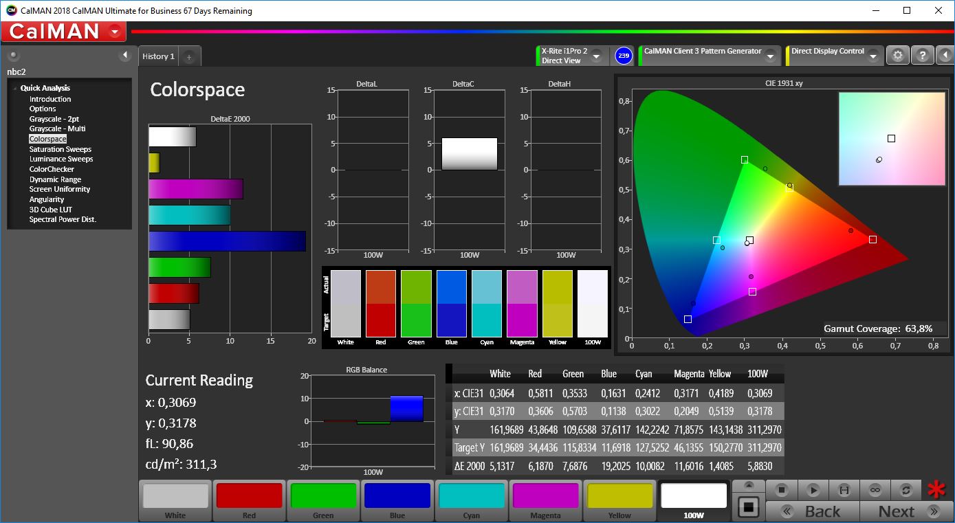 | sRGB Coverage (%) | 63.1 | 65.7 4% | 59.2 -6% | 54.2 -14% | 59.3 -6% | 59.6 -6% | 96.2 52% | 59.3 -6% | 62.8 0% |