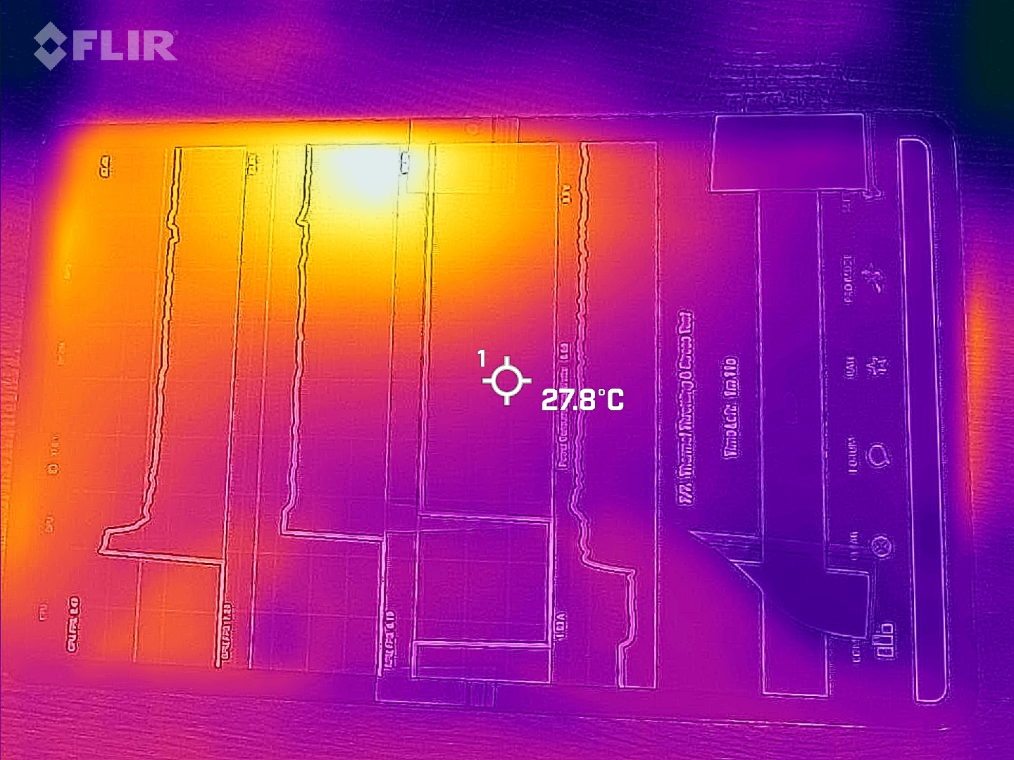 (+) Ohne Last messen wir eine durchschnittliche Temperatur von 25.6 °C auf der Oberseite. Der Klassendurchschnitt erreicht 30 °C.