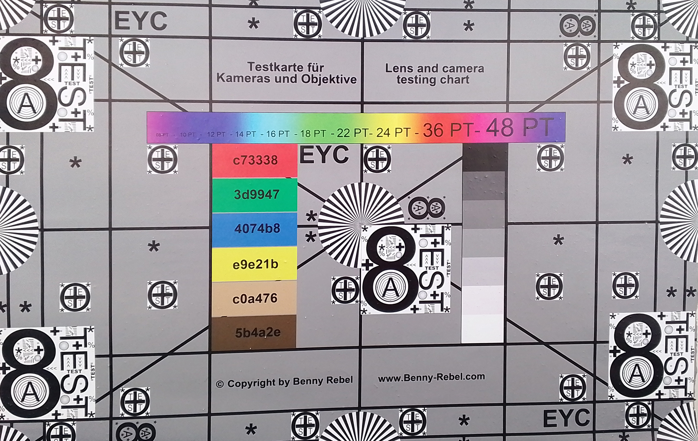 Bei optimaler Ausleuchtung gibt sie die Farben des ColorChecker-Testcharts ziemlich akkurat wieder und zeigt lediglich bei dunkleren Grün- und Brauntönen größere Abweichungen von den Referenzfarben. Auch der Testchart wird dann relativ scharf abgelichtet, wobei die Übergänge zwischen den Chart-Elementen aber bereits in Bildmitte ausgefranst sind.