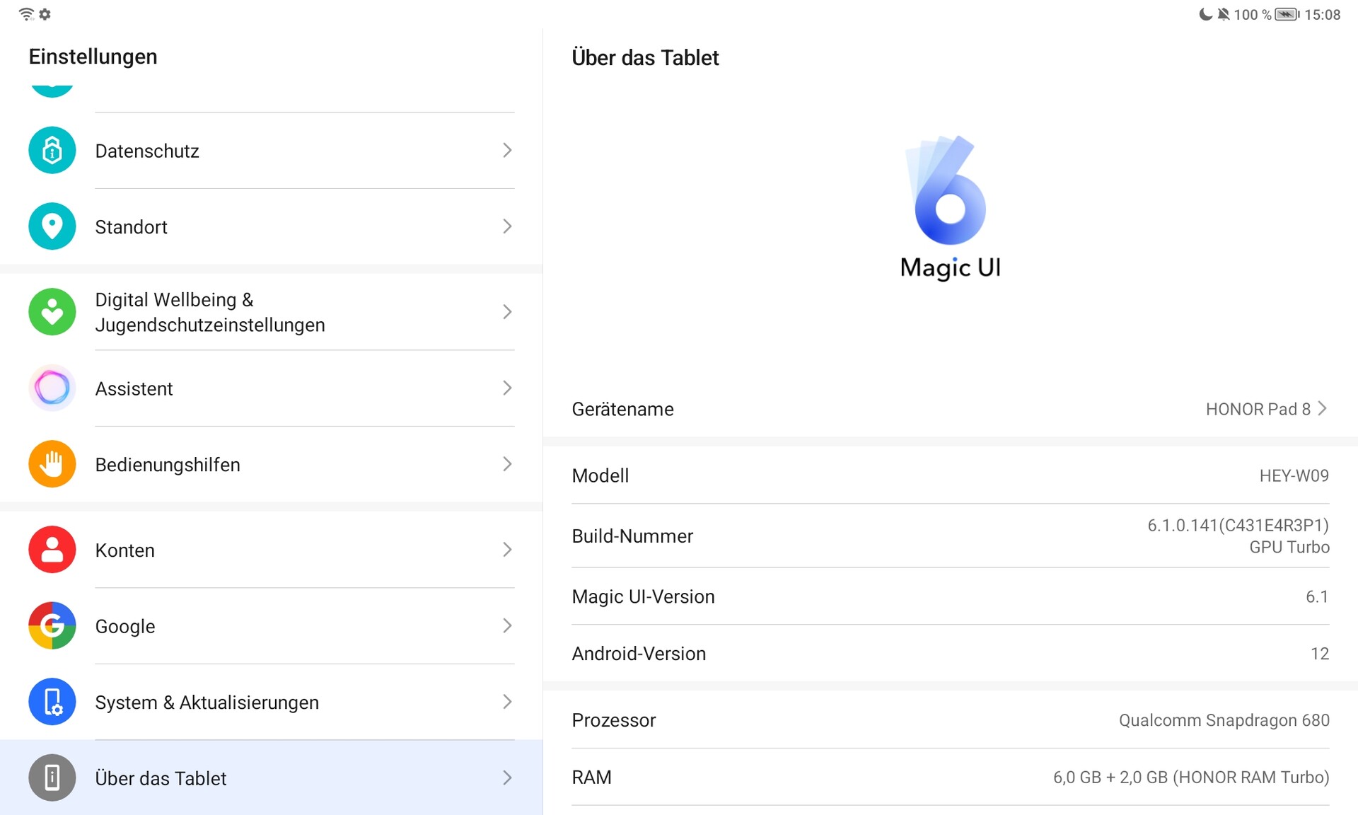 Auf dem Pad 8 läuft Android 12 in Verbindung mit Honors Benutzeroberfläche Magic UI 6.1. Zum Testzeitpunkt (Mitte November, Build-Nummer 6.1.0.141) sind die Android-Sicherheitpatches noch auf dem Stand vom 1. August 2022 und damit bereits ziemlich veraltet. Angaben darüber, wie lange das Pad 8 mit Sicherheitpatches und System-Upgrades versorgt werden soll, macht Honor nicht.