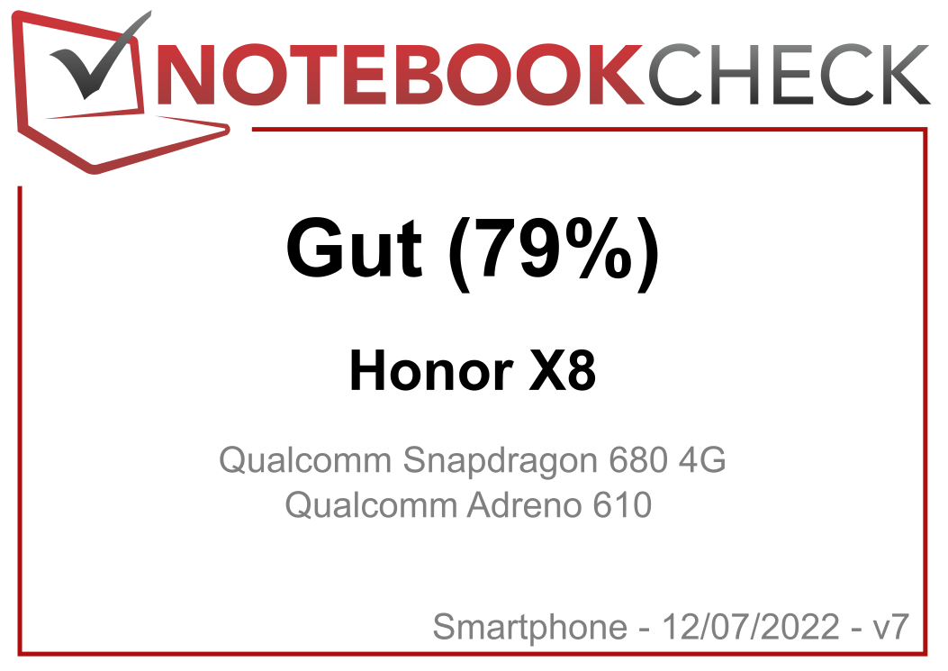 | 78.5 % v7 (old) | 07 / 2022 | Honor X8 SD 680, Adreno 610 | 177 g | 128 GB UFS 2.1 Flash | 6.70" | 2388x1080 | |