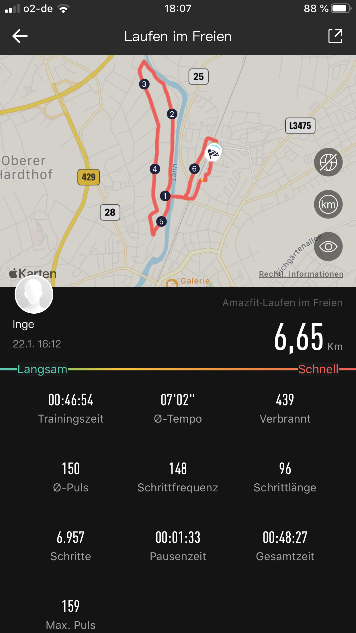 Da der Tracker kein eigenes GPS hat, muss für die Aufzeichnung das Smartphone mitgenommen werden. Über den Umstand an sich hinaus kann sich das auch auf die Zahlen auswirken. Im Test war die Bip Lite zunächst mit einem Google Pixel 3 verbunden. Der Lauf wurde parallel dazu mit einer Garmin Forerunner 645 mit integriertem GPS getrackt. Bei nahezu identischer Zeit fehlten der Bip Lite am Ende 2 ganze Kilometer. Schuld war in diesem Fall nicht die Uhr sondern ein Verbindungsproblem beim Smartphone. Bei einem weiteren Lauf wurde das Testgerät mit einem anderen iPhone 7 Plus gekoppelt. Die Abweichung beim zweiten Lauf war verschwindend gering.