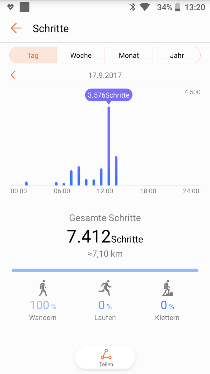 Alternativ kann in der Huawei-Applikation eingestellt werden, dass der Bildschirm durch das Heben des Armes aktiviert wird. Mit Hilfe des gezielten Drehens des Handgelenks ist es zudem möglich, zwischen den verschiedenen Analysedaten zu wechseln.
