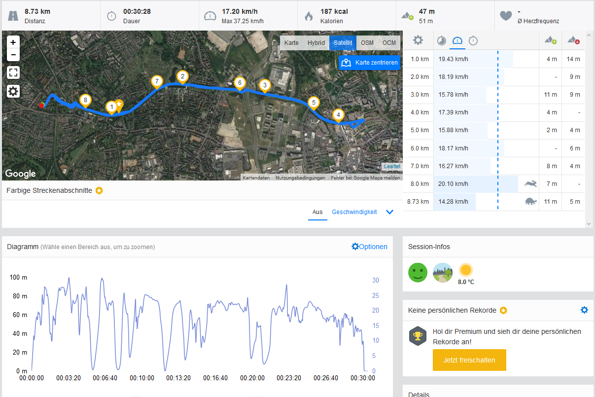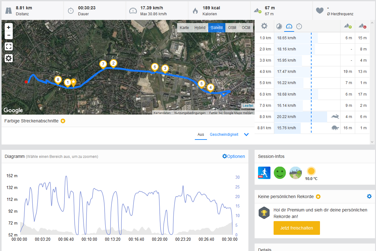Bei einer kleinen Radtour lassen wir das Huawei Mate 10 Pro im Flugzeugmodus gegen den Fahrrad-Computer Garmin Edge 500 antreten. Dabei gibt sich das Smartphone keine Blöße. Es zeigt zwar kleinere Abweichungen vom Streckenverlauf, ist unter dem Strich aber genauer als der Spezialist.