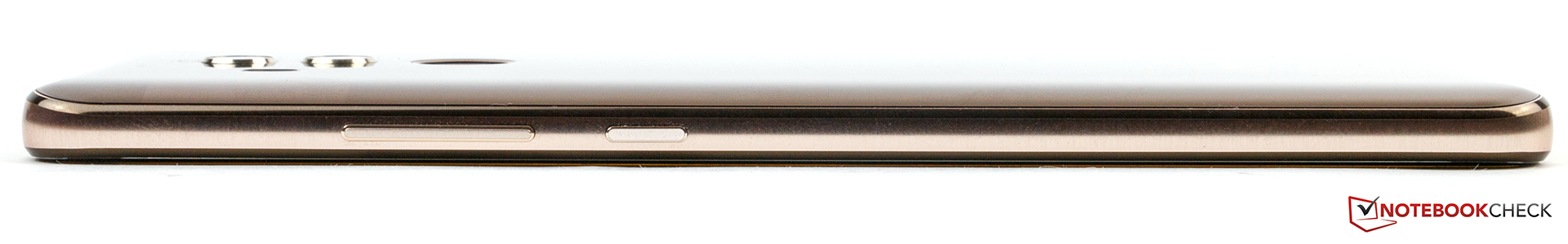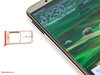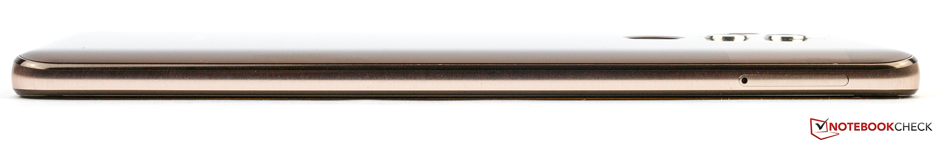 Das Smartphone ist mit seinen 7,9 Millimetern Bauhöhe etwas schlanker als das größere Galaxy Note 8, aber auch dicker als das V30. Wir haben eine Bauhöhe von 8,05 Millimetern gemessen, wahrscheinlich stellt der von Huawei angegebene Wert einen Mittelwert dar. Die beiden Kameralinsen ragen 0,55 Millimeter aus dem Gehäuse hervor. Die Verarbeitung wirkt enorm hochwertig. Die Spaltmaße sind sehr eng, bleiben aber stets gleichmäßig. Verwindungsversuche lässt das Mate 10 Pro ungerührt über sich ergehen. Der SIM-Slot schließt bündig mit dem Rahmen ab, hat in unserer braunen Variante jedoch nicht den selben Farbton, hebt sich optisch aber nicht zu stark ab. Der Kartenschlitten ist ebenfalls aus Aluminiumlegierung gefertigt und wird vollständig in der Rahmenfarbe gehalten. Er bietet Platz für zwei Nano-SIM-Karten, eine Speichererweiterung mittels microSD ist nicht vorgesehen.