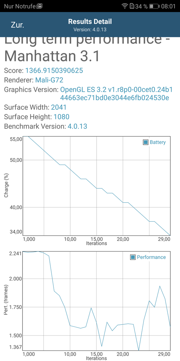 Mit dem GFXBench Akku Test analysieren wir das Temperaturverhalten des SoC bei kontinuierlicher Last. Dabei werden die jeweiligen Szenarien dreißigmal hintereinander durchgeführt und sowohl Akkustand als auch Framerate protokolliert. Im T-Rex-Test (Open GL ES 2.0) bleibt das Testgerät tadellos und liefert über die vollständige Dauer die volle Performance. Im anspruchsvollen Manhattan-Test (OpenGL ES 3.1) sieht dies jedoch schon anders aus. Zeitweise fällt in diesem Test die Leistung um fast 40 Prozent ab, was jedoch nicht dauerhaft ist und selbst der niedrigste Wert ist beinahe so hoch wie der Höchstwert des Mate 9.