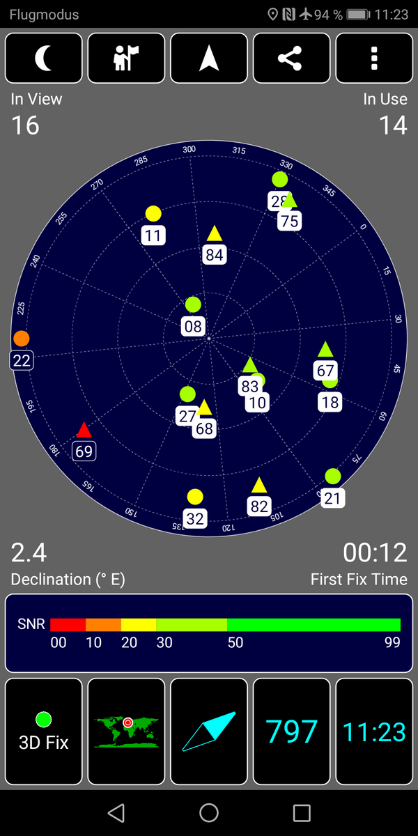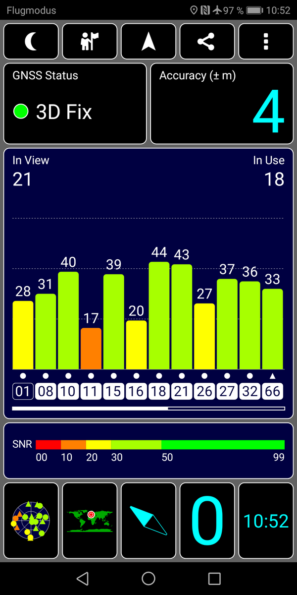 Die Positionsbestimmung des Huawei Mate 10 Pro erfolgt mit Hilfe der Satellitennetzwerke GPS, Glonass und BeiDou. Das europäische Galileo haben die Chinesen von der Liste der unterstützten GNSS gestrichen. Stattdessen sollen weitere Sensoren bei der Ortung helfen und auch dann noch zuverlässig den Nutzer navigieren, wenn kein direktes Satellitensignal verfügbar ist, wie es beispielsweise in Tunneln der Fall ist. Dafür nutzt das Smartphone zusätzlich den Gyro-, den G-Sensor und das Barometer. Dies soll auch eine möglichst schnelle Neuverbindung mit dem jeweiligen Navigationssystem gewährleisten. Der Satfix gelingt im Freien auf jeden Fall sehr schnell und ist auf bis zu vier Meter genau. Auch die Ortung im Keller war noch möglich, wenn auch dies erwartungsgemäß nur in der Nähe von Fenstern mit weniger Präzision möglich ist.