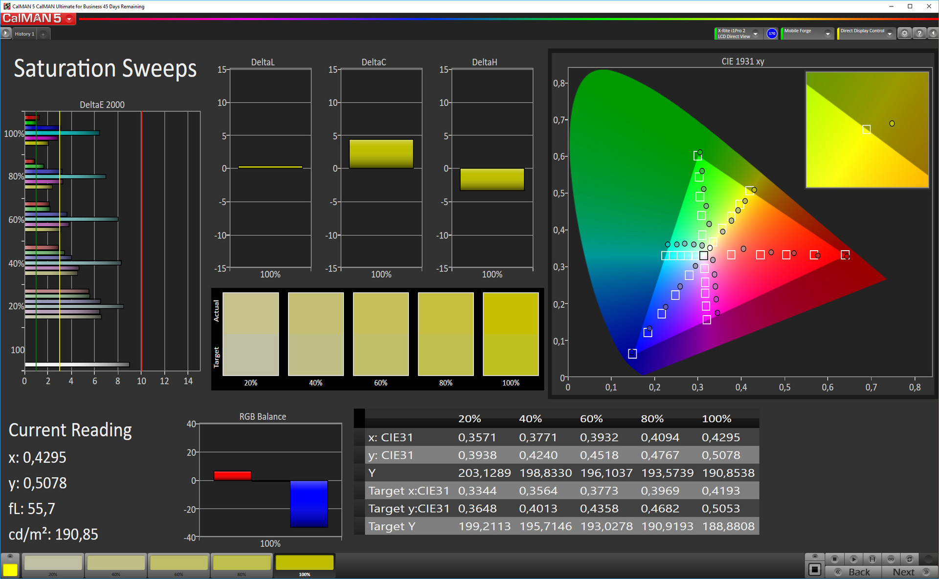 | Delta E Colorchecker * | 1.7 | 4.3 -153% | 3.2 -88% | 2.6 -53% | 1.3 24% | 2.8 -65% | 5.5 -224% | 7 -312% |