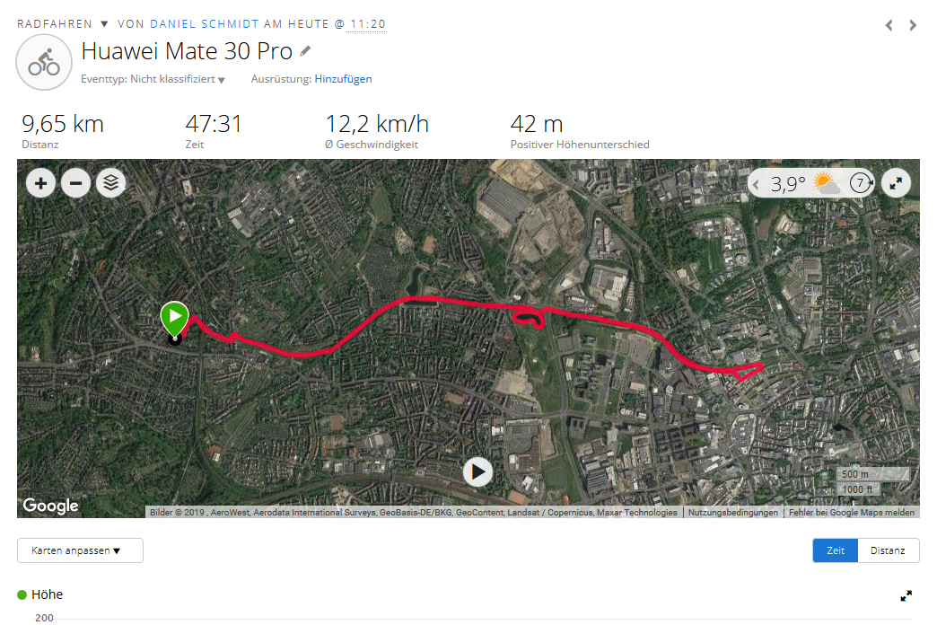 Auf einer kleinen Radtour muss sich das Huawei-Handy dem Vergleich mit dem Garmin Edge 500 stellen. Dabei beträgt die Differenz der aufgezeichneten Gesamtstrecke recht üppige 210 Meter, jedoch zeigt sich beim Blick in den Streckenverlauf, dass das Mate die höhere Genauigkeit besitzt.