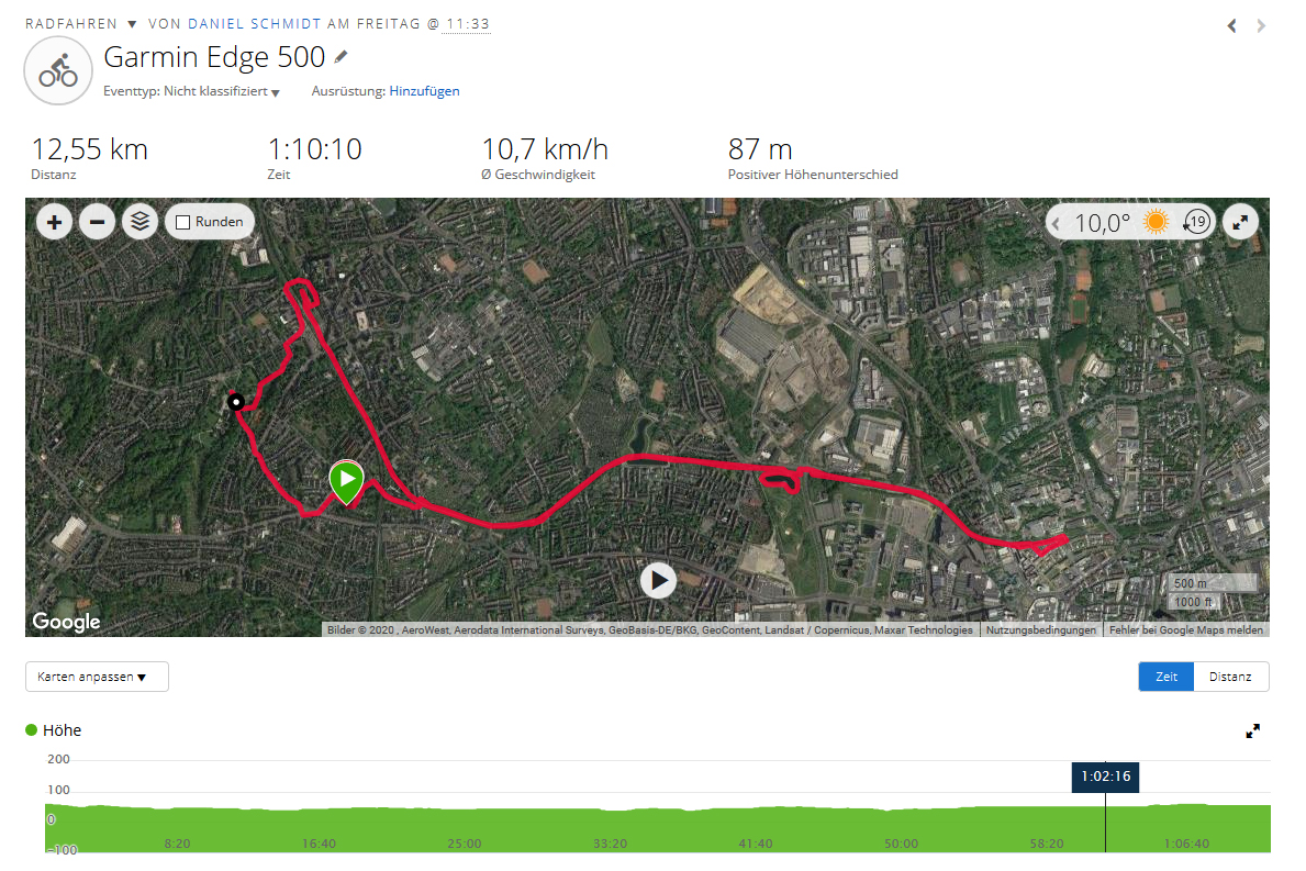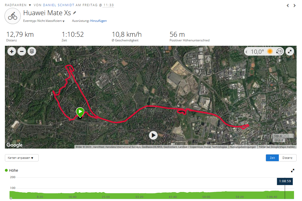 Auf unserer kleinen Radtour muss sich das faltbare Smartphone dem Vergleich mit dem Garmin Edge 500 stellen, welchen das Testgerät für sich entscheiden kann, denn die Ortung erfolgt sehr genau und zeigt nur leichte Abweichungen von der gefahrenen Strecke.