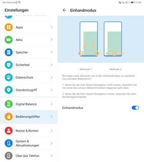 Das Mate Xs bietet auch andere bekannte Eingabehilfen wie einen Handschuh- und Einhandmodus. Letzterer funktioniert aber weder mit der Drei-Tasten-Navigation noch mit der Gestensteuerung, wenn das Smartphone auseinandergefaltet ist. Die Knöchelgesten funktionieren zwar, aber das Display gibt unter dem Klopfen sichtbar nach, was immer ein mulmiges Gefühl hinterlässt.