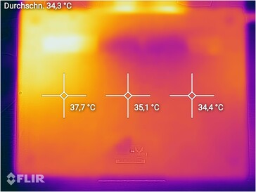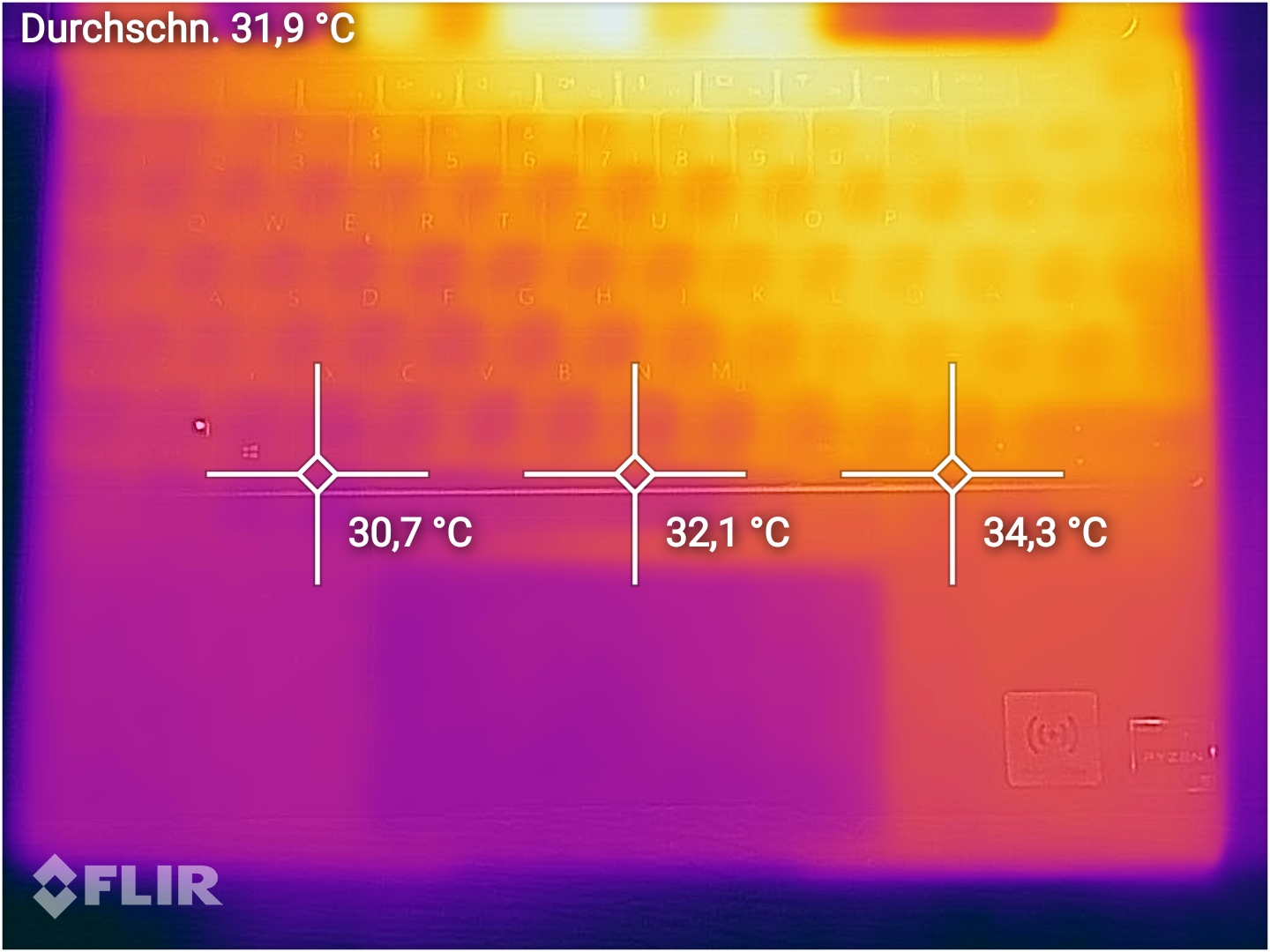 (+) Die Handballen und der Touchpad-Bereich erreichen maximal 32.6 °C und damit die typische Hauttemperatur und fühlen sich daher nicht heiß an.