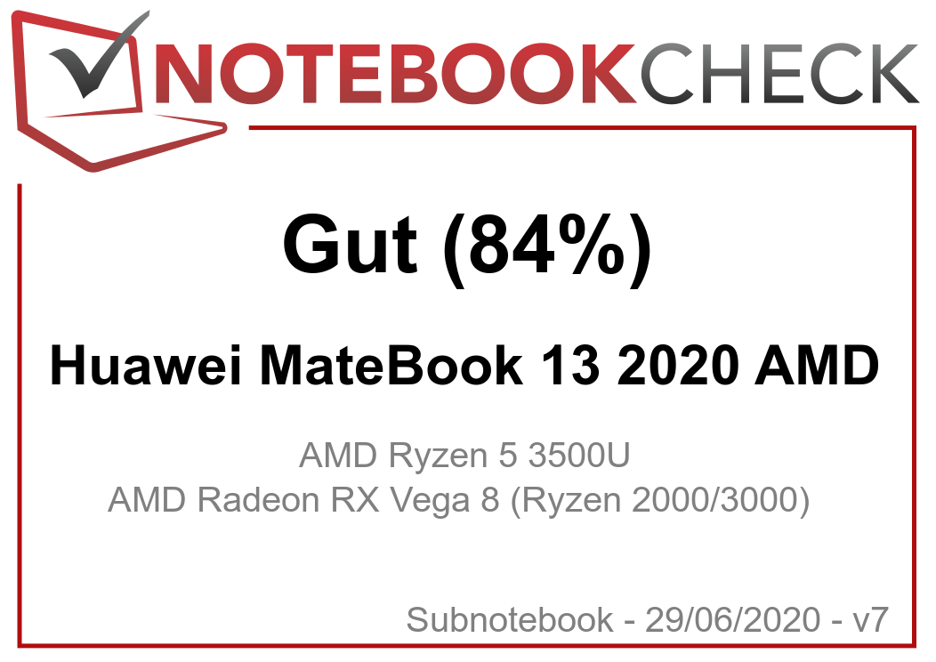| 84 % v7 (old) | 06 / 2020 | Huawei MateBook 13 2020 AMD R5 3500U, Vega 8 | 1.3 kg | 14.9 mm | 13.00" | 2160x1440 | |