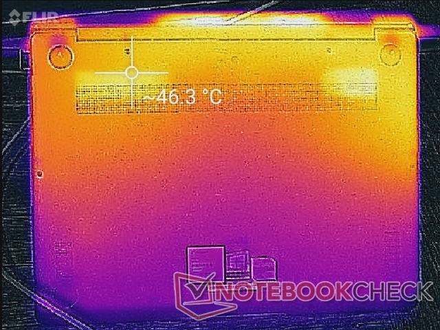 Bei ruhendem Desktop erwärmte sich die Unterseite bei einer Raumtemperatur von 22 °C auf etwa 27 °C. Bei aktiver Nutzung stieg dieser Wert zwar schnell an, das Notebook wurde aber nie unangenehm warm. Zum Spielen empfehlen wir dagegen unbedingt einen Tisch als Unterlage, da die Unterseite unter Last bis zu 46 °C erreichen kann.