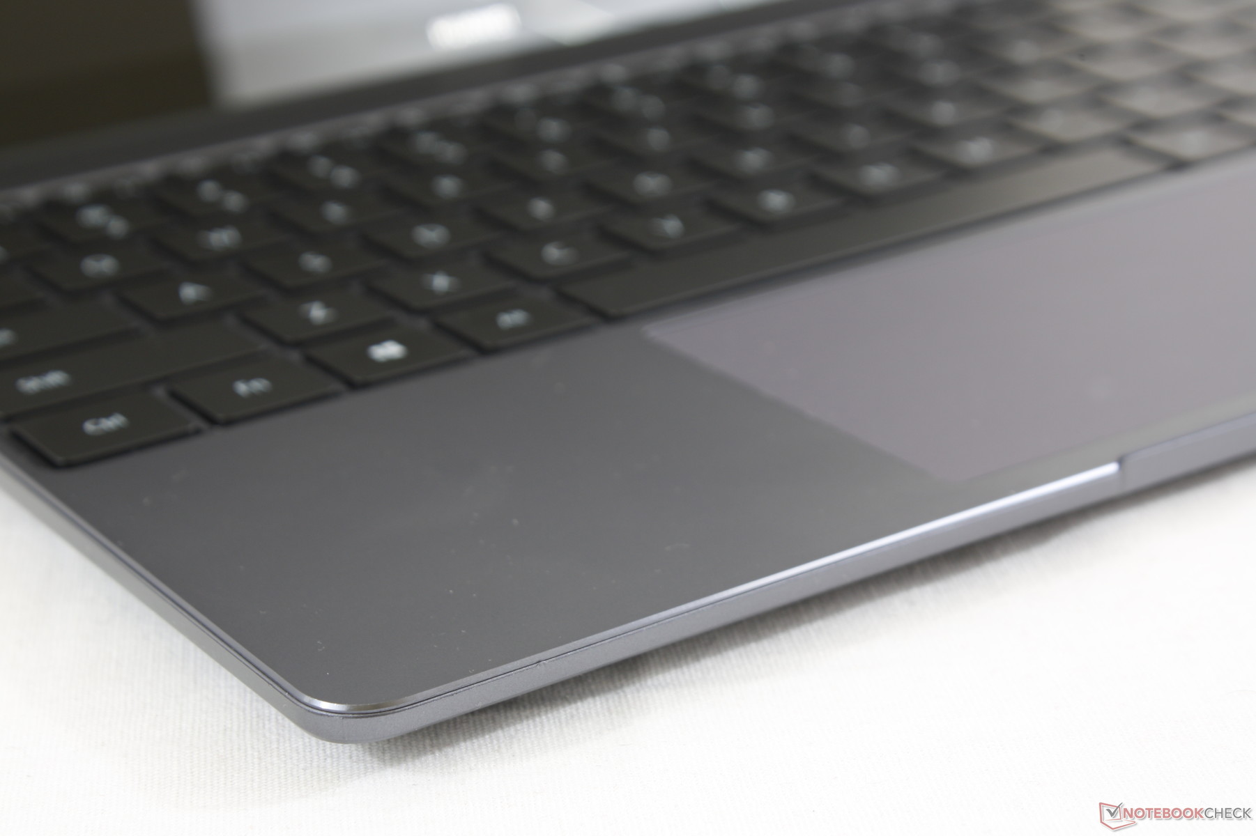 Das sehr breite Touchpad liegt mit 12 x 6,5 cm zwischen dem des XPS 13 (10,5 x 6 cm) und dem des MateBook X Pro (12 x 7,8 cm). Die Oberfläche ist angenehm glatt und gleichmäßig und das Touchpad bietet bis in die Ecken hinein sehr angenehme Gleiteigenschaften und eine hohe Präzision.