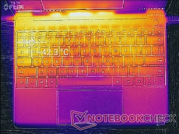 (±) Die maximale Temperatur auf der Oberseite ist 44.2 °C. Im Vergleich liegt der Klassendurchschnitt bei 35.9 °C (von 21.4 bis 59 °C für die Klasse Subnotebook).