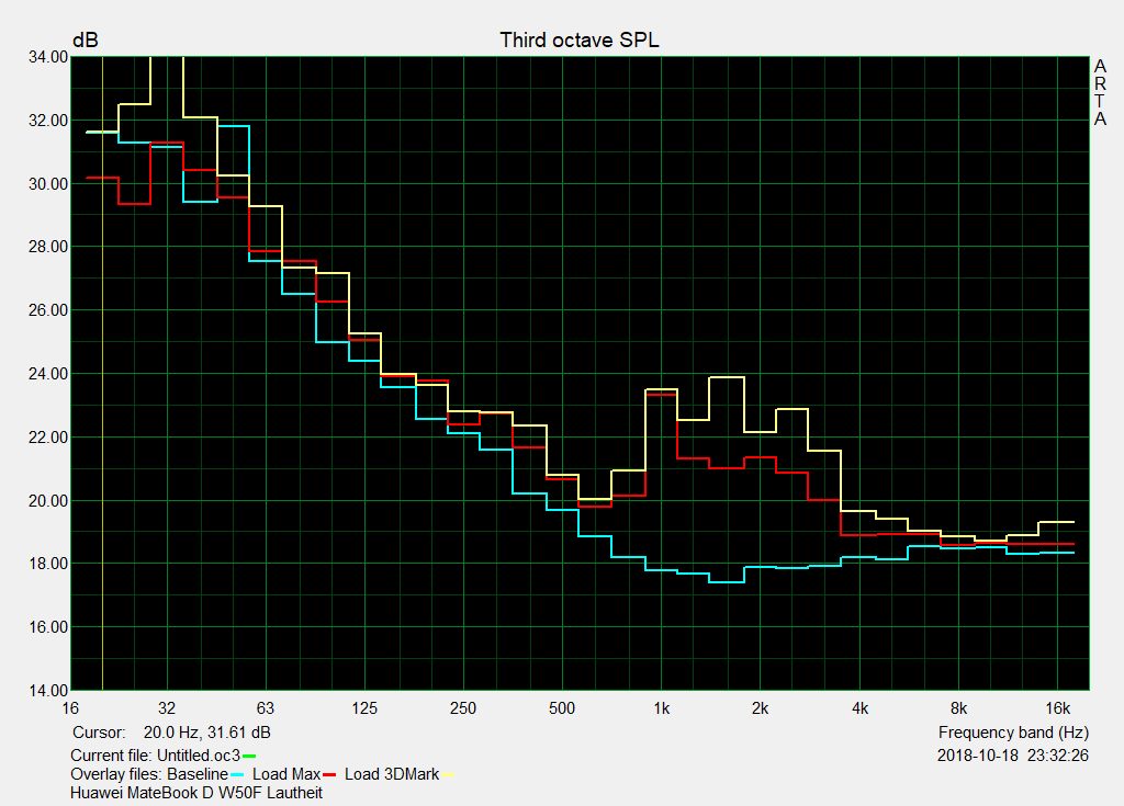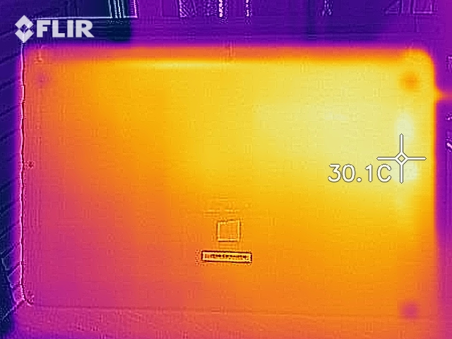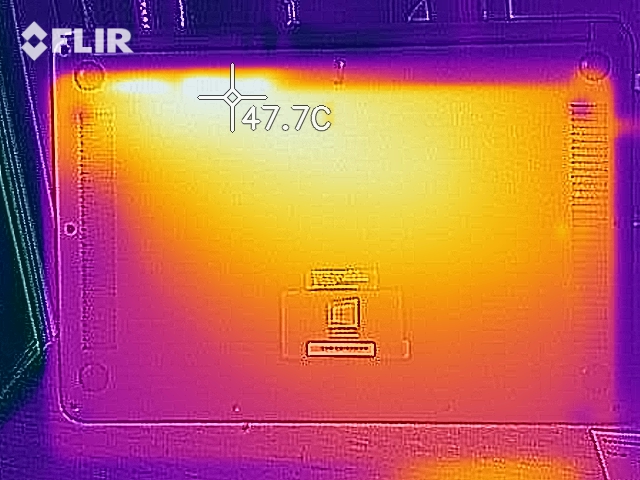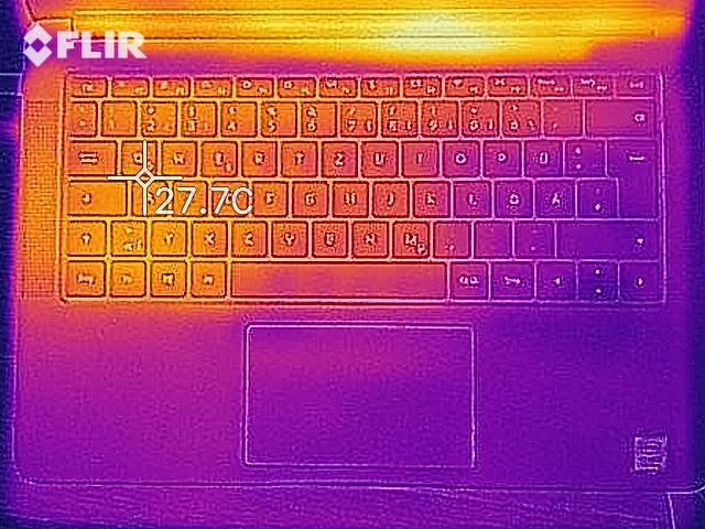 Im Idle-Betrieb sind die Oberflächentemperaturen des MateBook kein Thema. Für den unwahrscheinlichen Fall, dass jemand mit dem Gerät auf dem Schoß lang anhaltende Dauerlast verursacht, können an der Unterseite Temperaturen von bis zu 44 °C entstehen, die auf Dauer nicht mehr jeder als angenehm empfindet. Der Bereich des Clickpads wurde hier mit über 38 °C ungewöhnlich warm, während die rechts und links davon liegende Handballenablage maximal 29 °C erreichte.