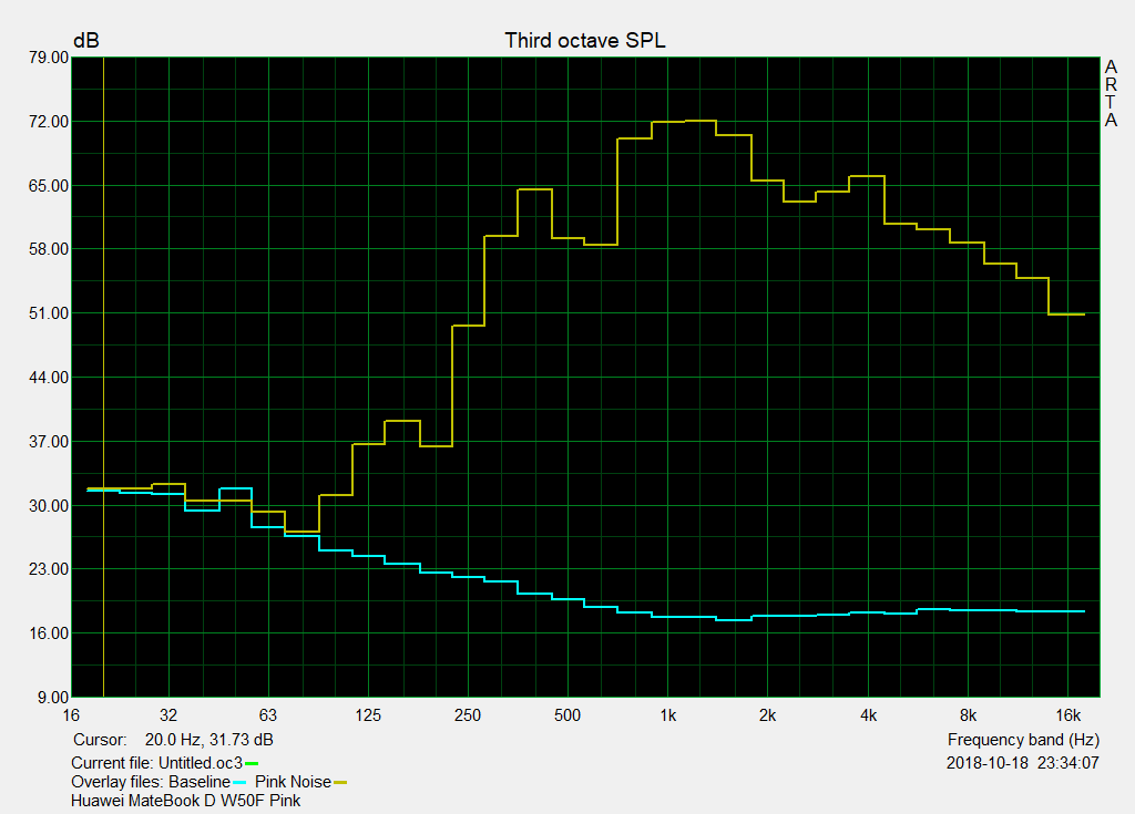 Huawei bewirbt das MateBook D 14 2018 unter anderem mit seinem Dolby Atmos Sound und nimmt den Mund dabei recht voll. Wir zitieren: "Der Vierfach-Lautsprecher mit Split-Frequency bietet Tieftöner mit tiefem, resonantem Bass und Hochtöner mit klaren Höhen für ein knackiges, intensives Klangerlebnis." Das können wir (erwartungsgemäß) nicht bestätigen. Gleichwohl macht das Soundsystem mit seinen beiden nach oben abstrahlenden, neben der Tastatur angebrachten Speaker-Systemen eine für Notebookverhältnisse überdurchschnittlich gute Figur.