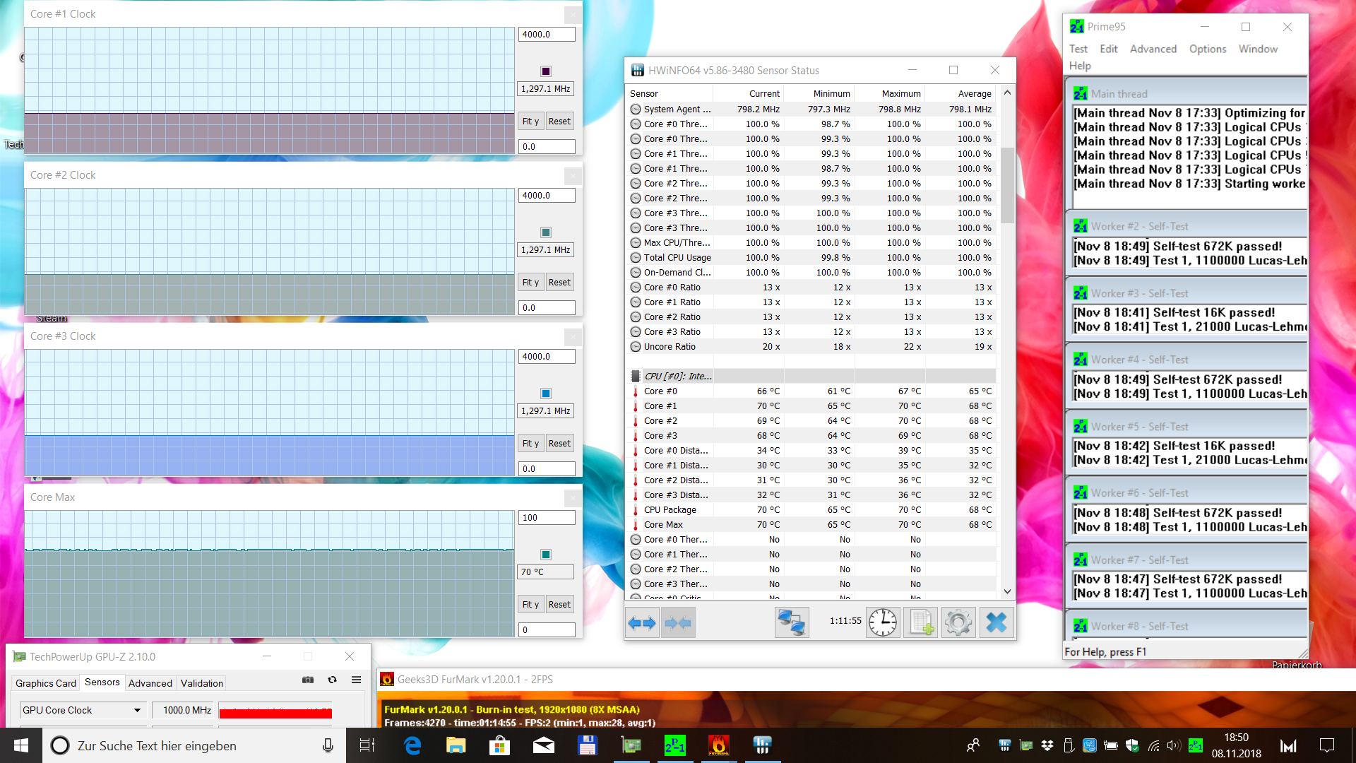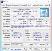 Nach Aktivierung des praxisfernen Stresstests (Prime95 + FurMark) sanken die Kerntakte binnen weniger Sekunden auf 1,3 GHz ab und schwankten danach in größeren Zeitabständen zwischen diesem Wert und nur noch 1,2 GHz, die CPU blieb dabei dauerhaft auf 67 bis 70 °C. Im Hinblick auf den Basistakt der CPU von 1,6 GHz liegt somit deutliches Throttling vor. Dass der Hersteller der in den Prozessor integrierten GPU bei der Zuteilung der TDP den Vorzug gegeben hat, kann man daran erkennen, dass diese durchgehend mit 900 - 950 MHz unterwegs war, was deutlich näher am maximalen Turbo von 1.100 MHz liegt, als das bei den CPU-Kernen der Fall ist.