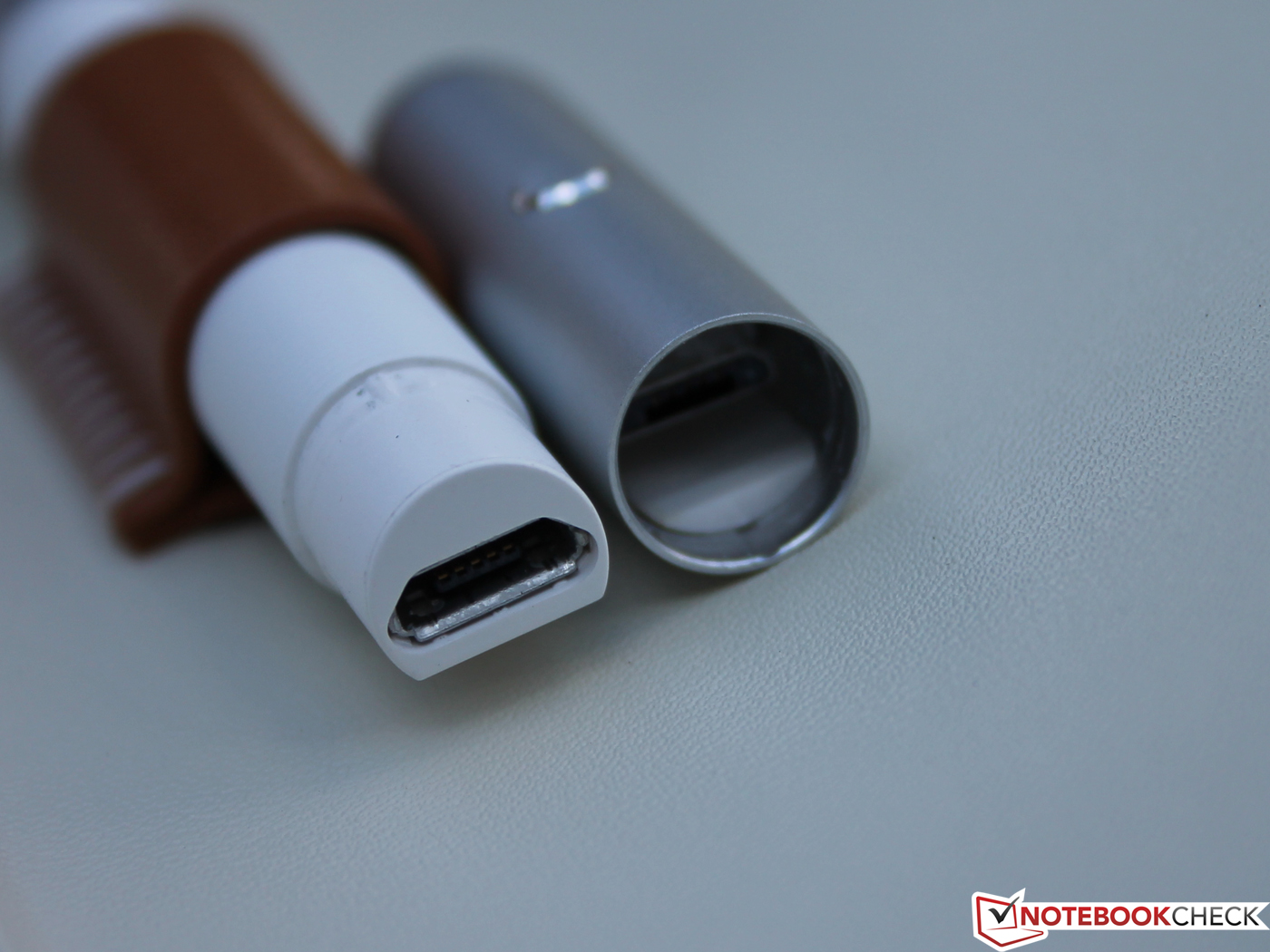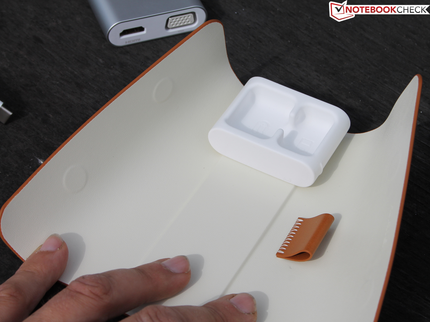 Die Docking-Station bringt zwei Typ-A USB-3.0-Ports mit, leider aber keinen weiteren Type-C. Im Schreibtisch-Einsatz wird der Type-C-Port am Dock durch das Netzteil belegt, das feste Kabel am Dock steckt dann im einzigen Type-C-Anschluss des Gerätes. Hierüber wird geladen. Jetzt ist aber kein weiterer Type-C frei, etwa um mit dem beigelegten Kabel den Stift zu laden.