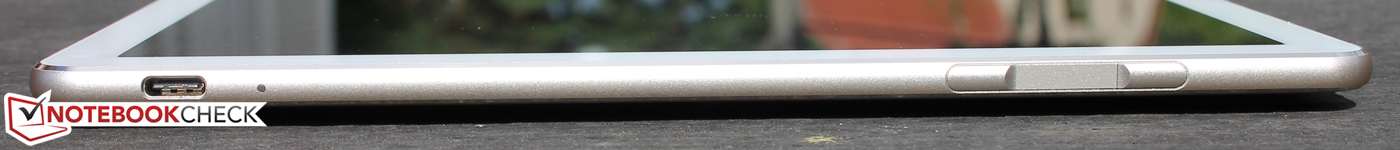 Die Stereo-Lautsprecher befinden sich im Tablet an der Oberseite. Die Lautstärke kann recht hoch eingestellt werden, sonderlich ausgewogen und differenziert hört sich das Ergebnis aber nicht an, eher mittenlastig ohne Tiefen. Höhen werden vergleichsweise sauber abgebildet, doch der Klang eines besseren Stereo-Laptop-Sounds mit hochwertigen Treibern wird nicht erreicht.