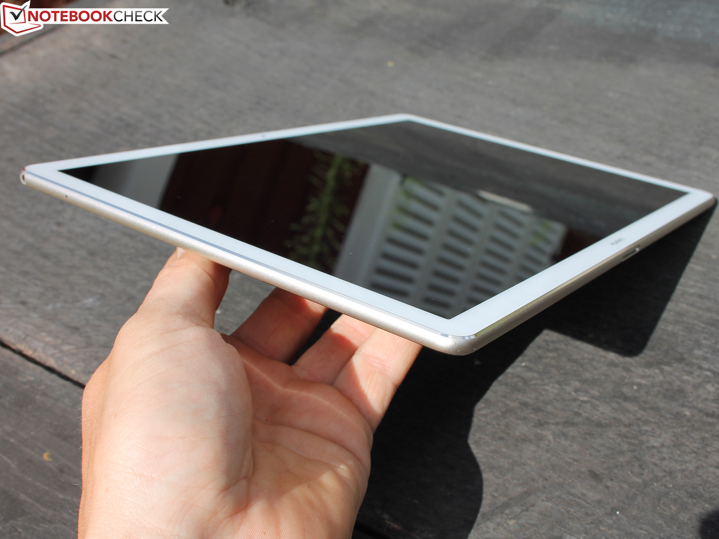 Das flache Gehäuse ist überraschend robust und gegen Verwindungen relativ resistent. Normaler Druck auf das Panel erzeugt keine Druckstellen. Der Alu-Rahmen gibt dem Gerät eine stilvolle Note und sorgt für eine hohe Festigkeit an den Rändern. Rückseite und Ränder sind ein Bauteil, das ist der Grund für die hohe Festigkeit.