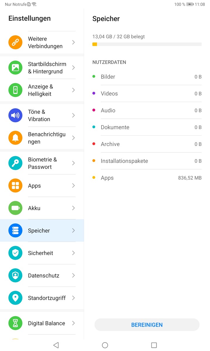 Bei unserem Testgerät waren im zurückgesetzten beziehungsweise werksfrischen Zustand nur noch 17,2 GB der nominell 32 GB frei. Immerhin lässt sich der Speicherplatz über eine microSD-Karte um bis zu 512 GB erweitern, was für Multimedia-Inhalte eine ganze Weile ausreichen dürfte. App-Daten konnten wir allerdings keine auf die microSD-Karte auslagern.