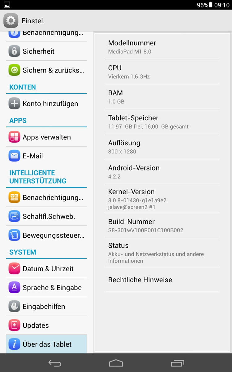 Die Displaydiagonale des Huawei MediaPad M1 8.0 beträgt 8 Zoll. Die Auflösung beläuft sich auf 1.280 x 800 Bildpunkte, was einem Seitenverhältnis von 16:10 und einer Pixeldichte von rund 189 PPI entspricht. Letzteres ist zwar nicht sensationell hoch, reicht jedoch vollkommen aus und ist in dieser Geräteklasse absolut üblich.