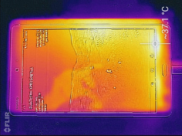 Der schwache Snapdragon 435 hat einen Vorteil: Dank seiner geringen Taktung wird kaum Hitze erzeugt, was, selbst unter Last, ein kühles Gerät bedeutet. Einen Hotspot haben wir aber gefunden - im mittleren linken Teil der Rückseite. Aber da dieser Punkt beim Halten nicht berührt werden sollte, wird das kein weiteres Problem sein. Ein wenig aufwärmen wird sich das Gerät beim Gamen oder unter Last schon, sodass es in den Händen spürbar ist - aber das passiert nur wenn das Tablet Stress ausgesetzt wird; beim alltäglichen Browsen und Video-Streamen wird es sich nicht aufheizen.