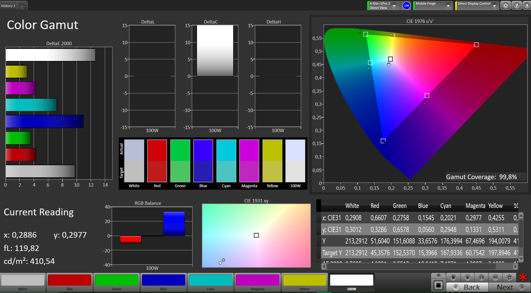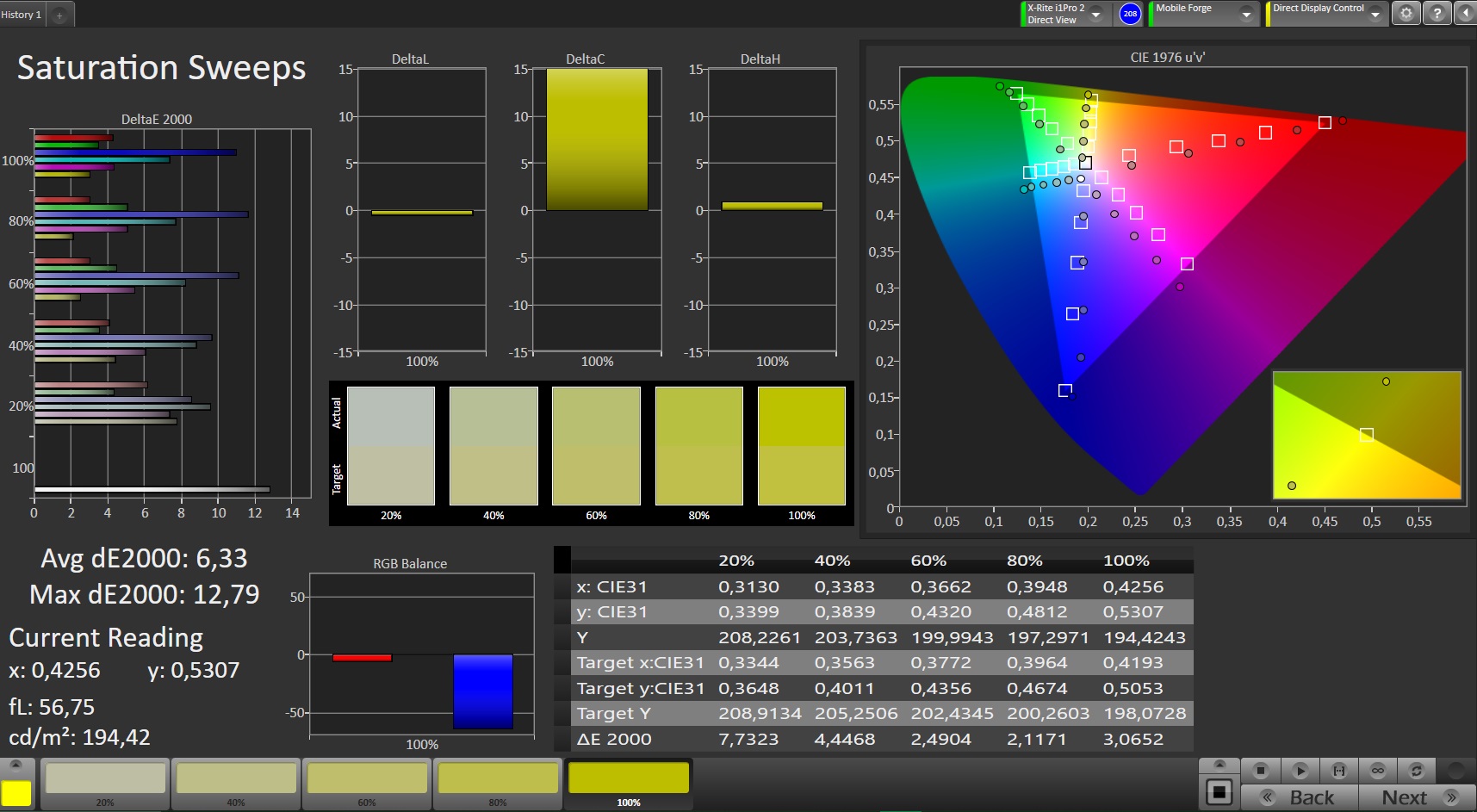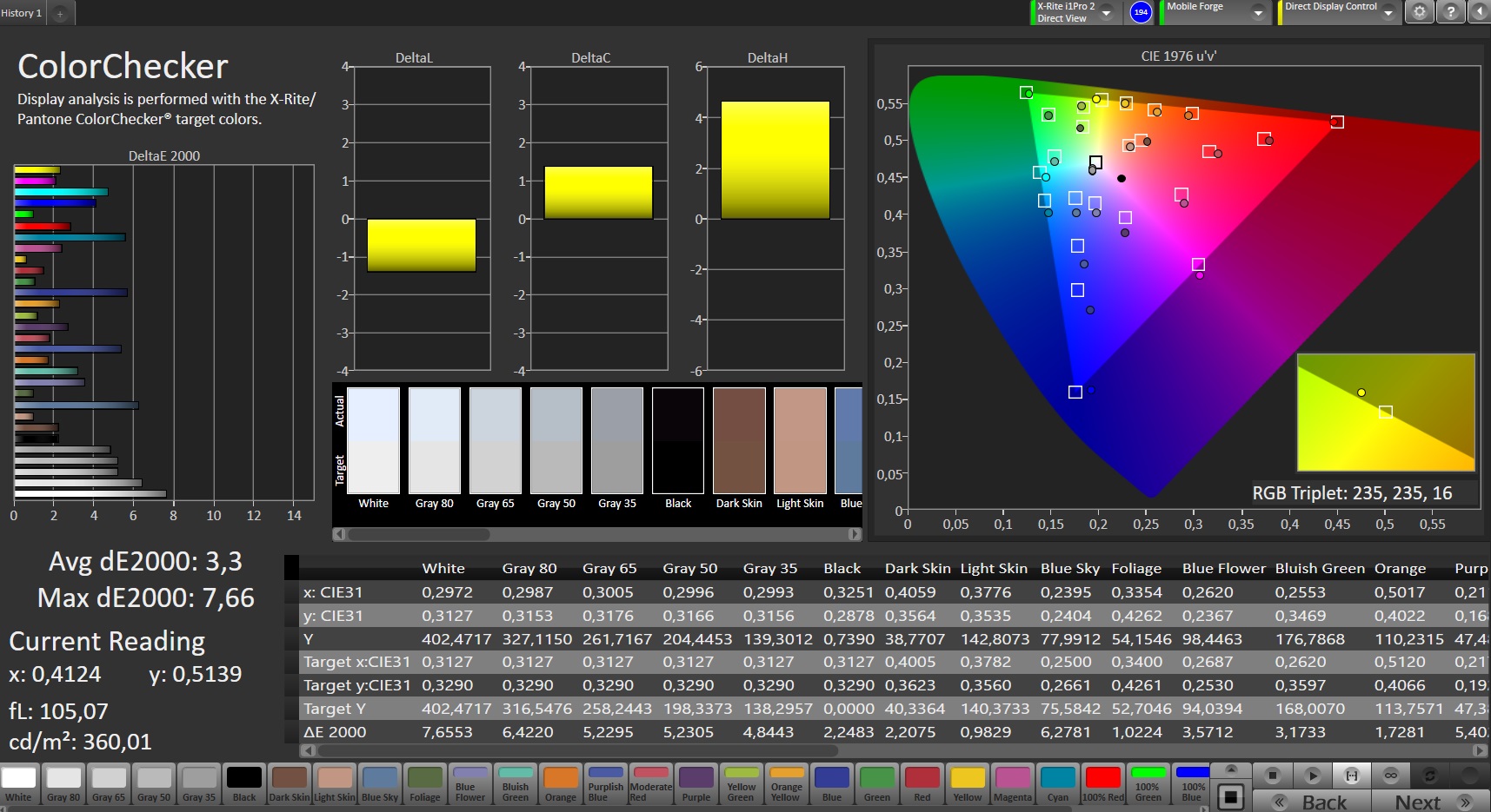| Delta E Colorchecker * | 6.83 | 15 -120% | 1.2 82% | 3.3 52% | 4.5 34% | 2.8 59% |
