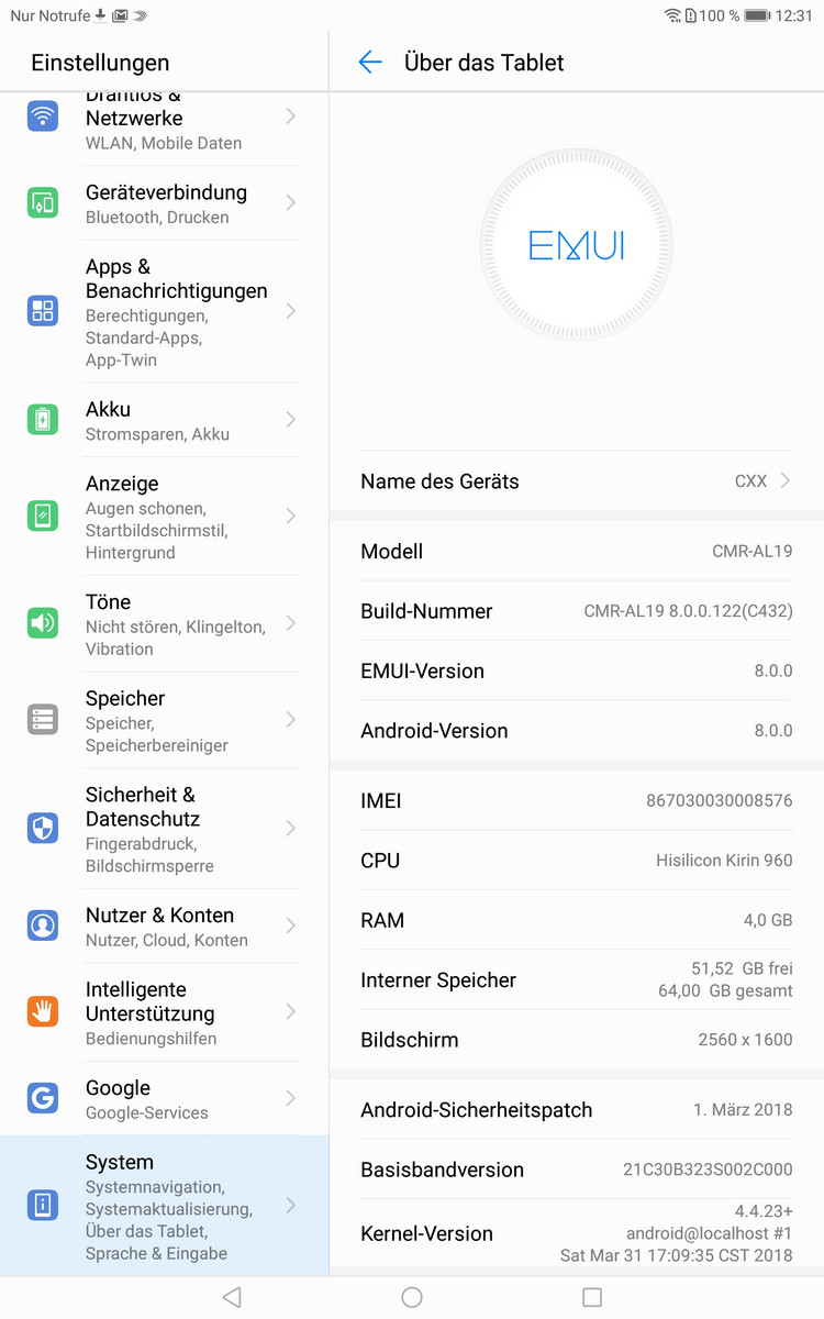 Huawei stattet das MediaPad M5 10.8 Pro mit dem aktuellen Android 8.0 Oreo aus und ergänzt es um seine bekannte EMUI-Benutzeroberfläche, ebenfalls in der Version 8.0. Insgesamt meldet das ROM einigen Platzbedarf an, denn im werksfrischen Zustand sind von den nominell 64 GB Speicherplatz lediglich 51,5 GB frei. Das liegt jedoch nicht nur am Huawei UI, sondern auch an den vielen vorinstallierten Apps.